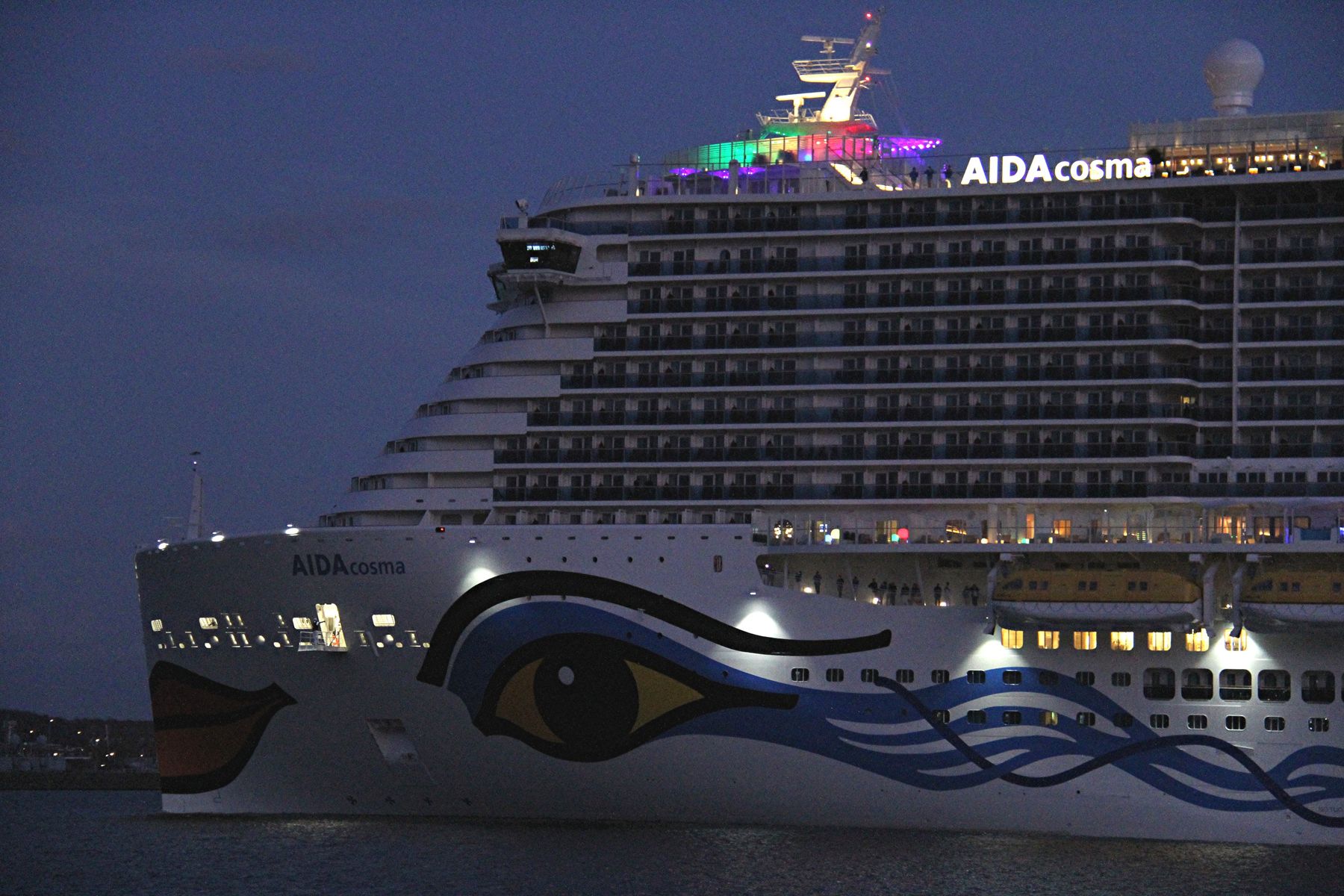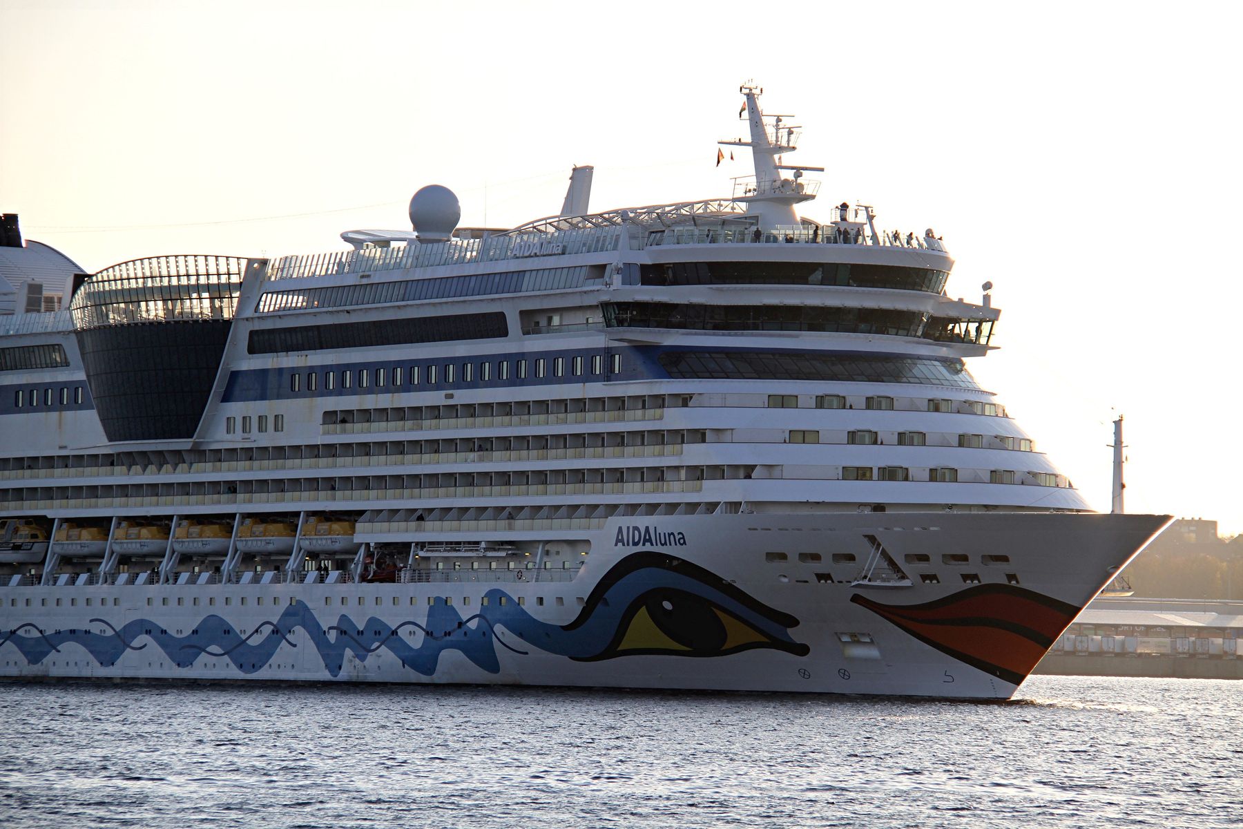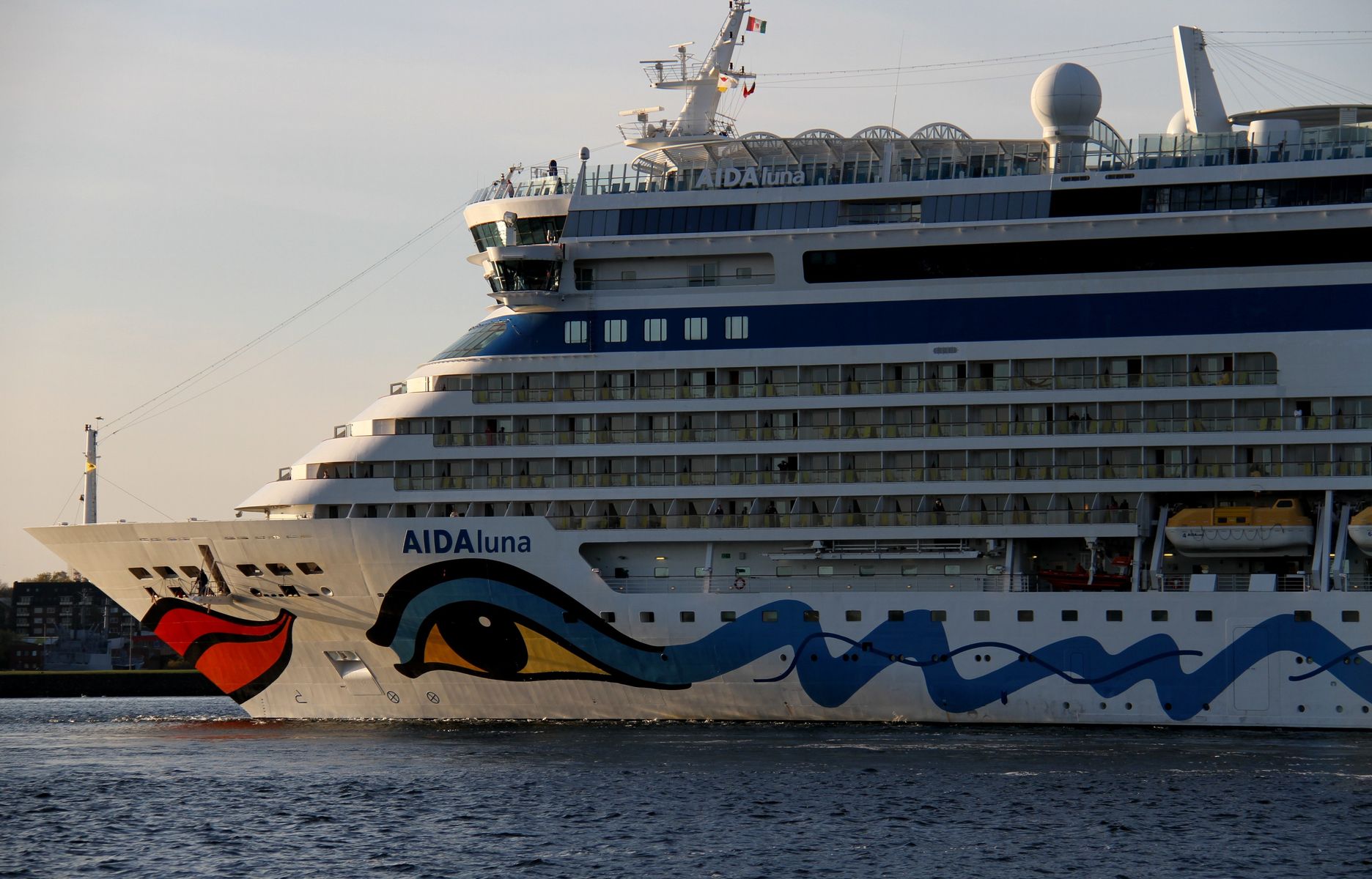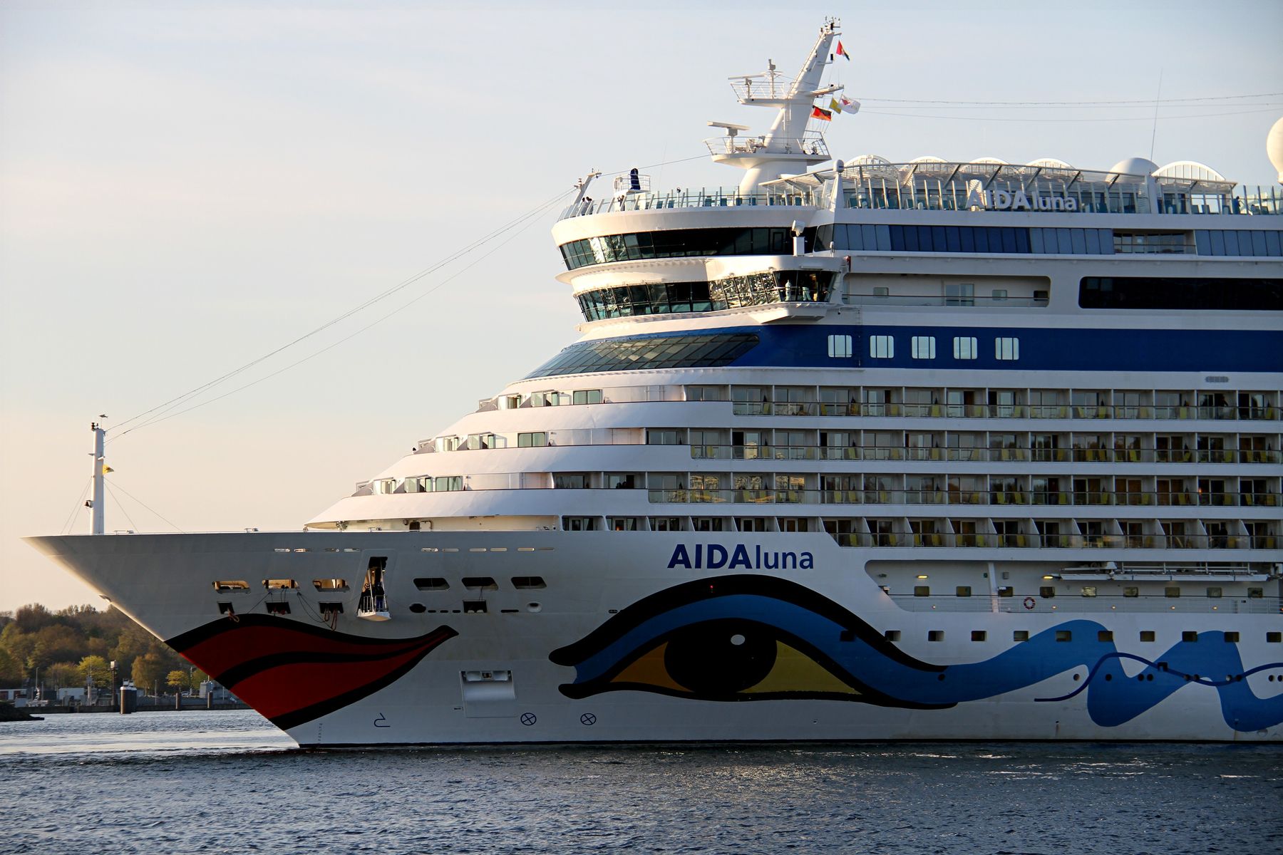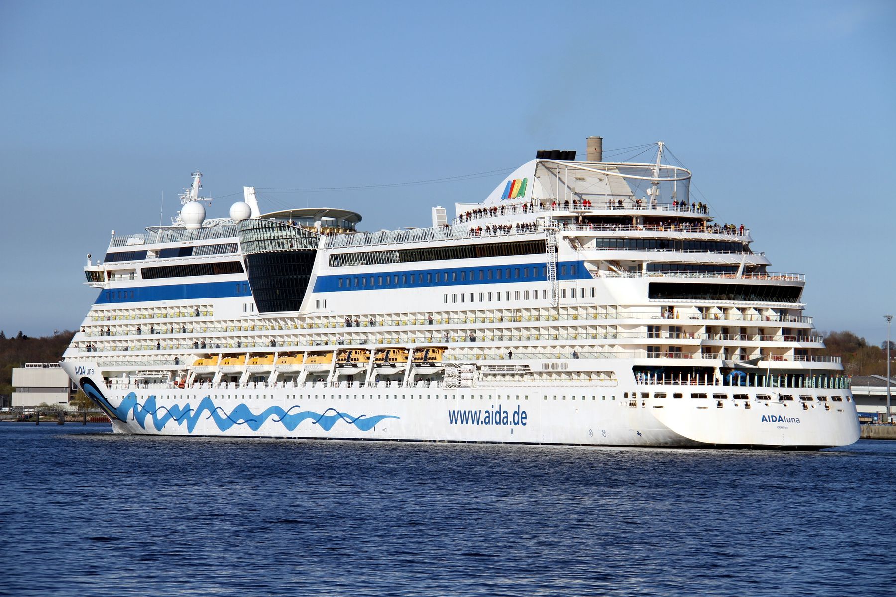 Die AIDAluna fährt um 18:03 h auf der "Kieler Förde" ihr Auslaufmanöver