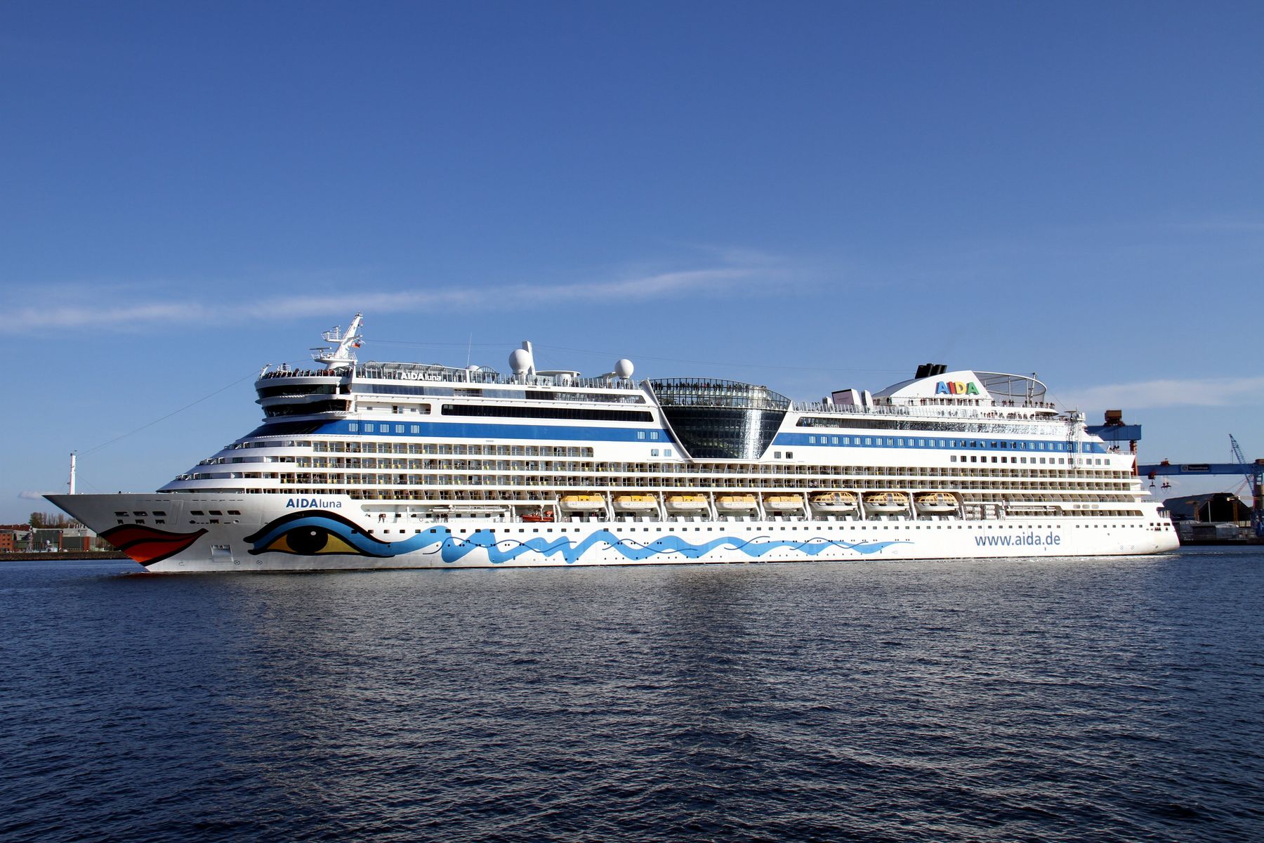 Die AIDAluna fährt unter einem azurblauen Himmel rückwärts zum "Liegeplatzt 27" am Ostseekai