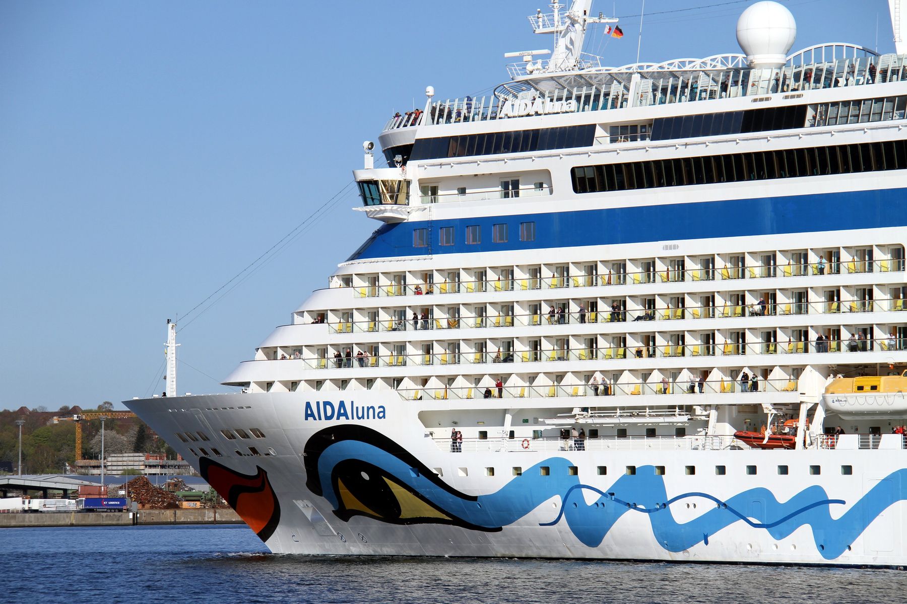 Die AIDAluna fährt unter einem azurblauen Himmel rückwärts zum "Liegeplatzt 27" am Ostseekai