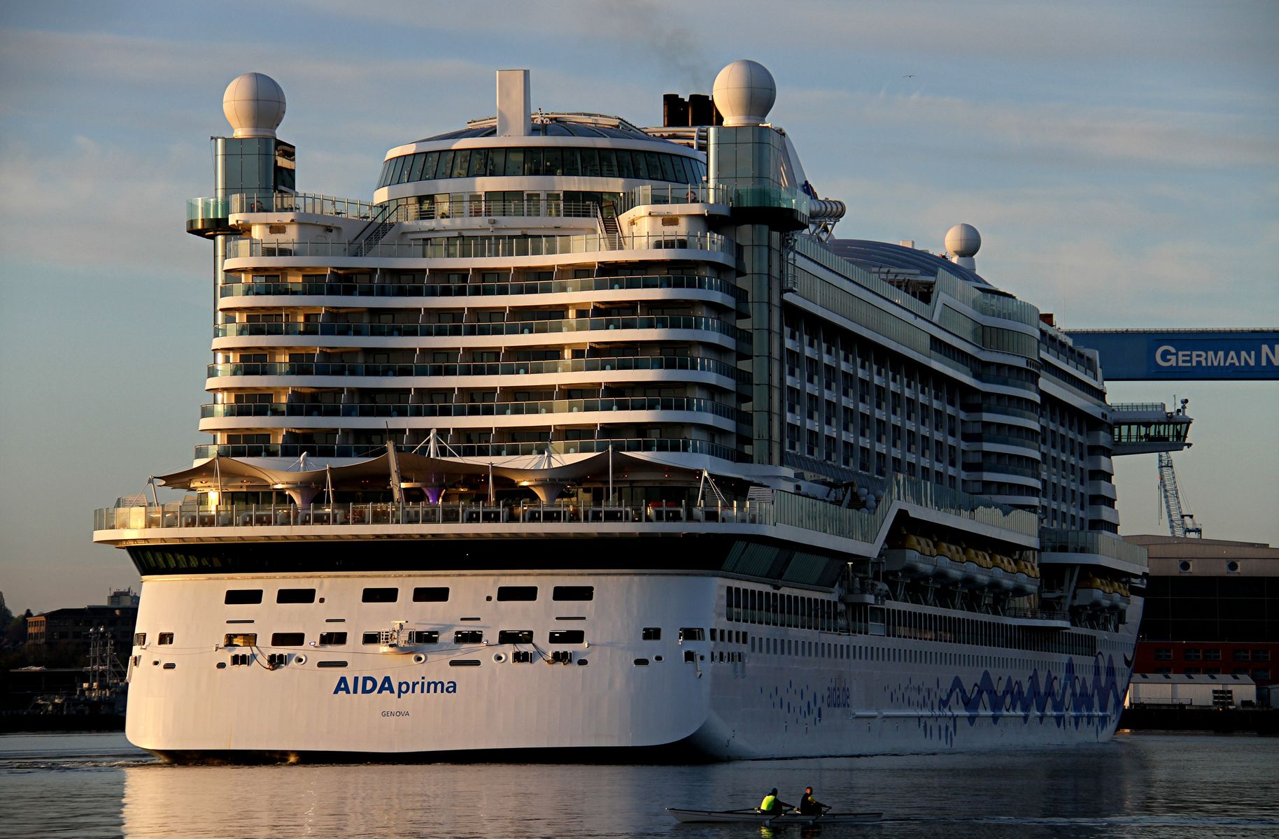 Mit einem Sonnenaufgang kommt die AIDAprima auf der "Kieler Förde" um die Ecke gefahren