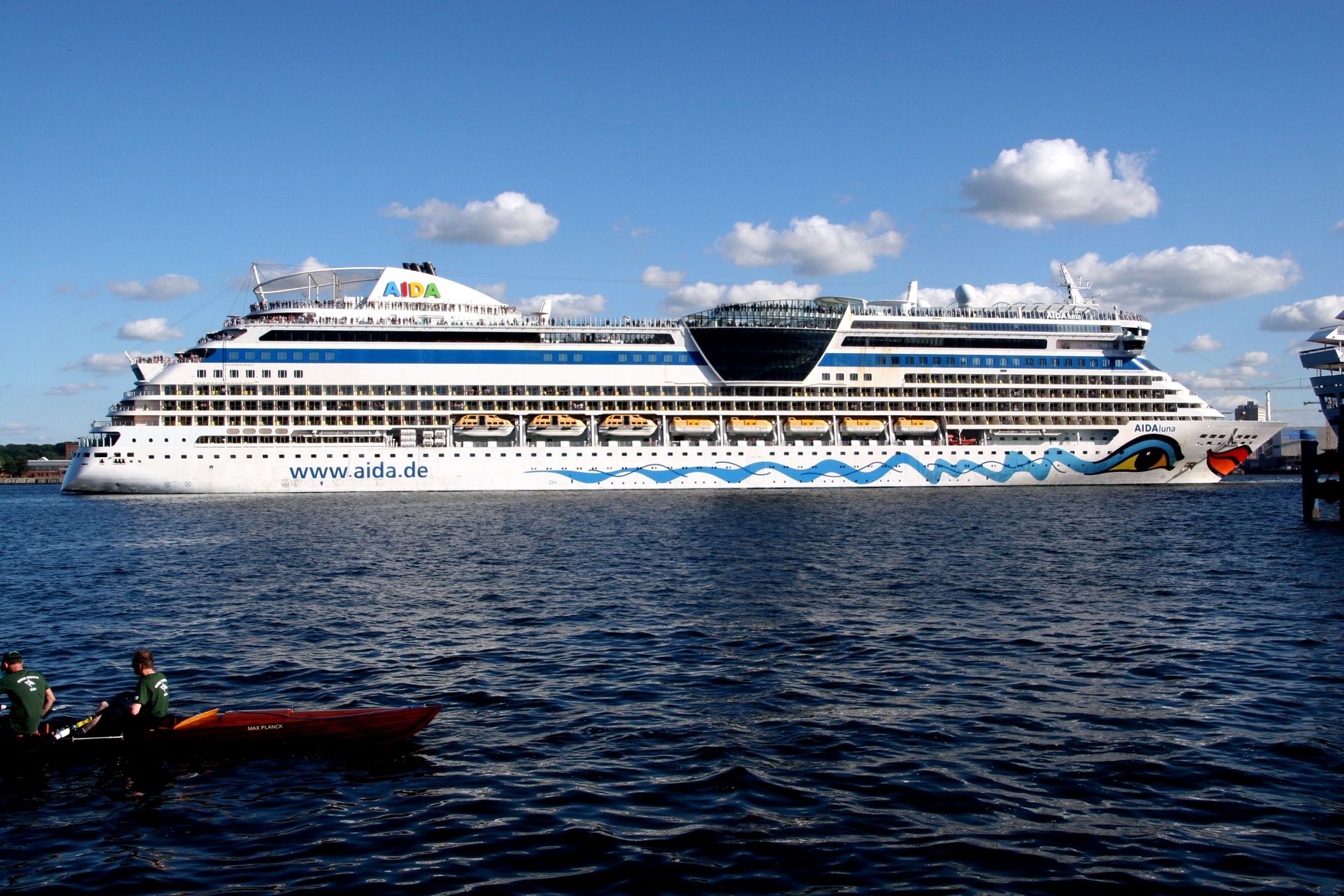 Die AIDAluna hat mit dem Bug zur Flaniermeile "Kiellinie" auf dem "Teller" gedreht