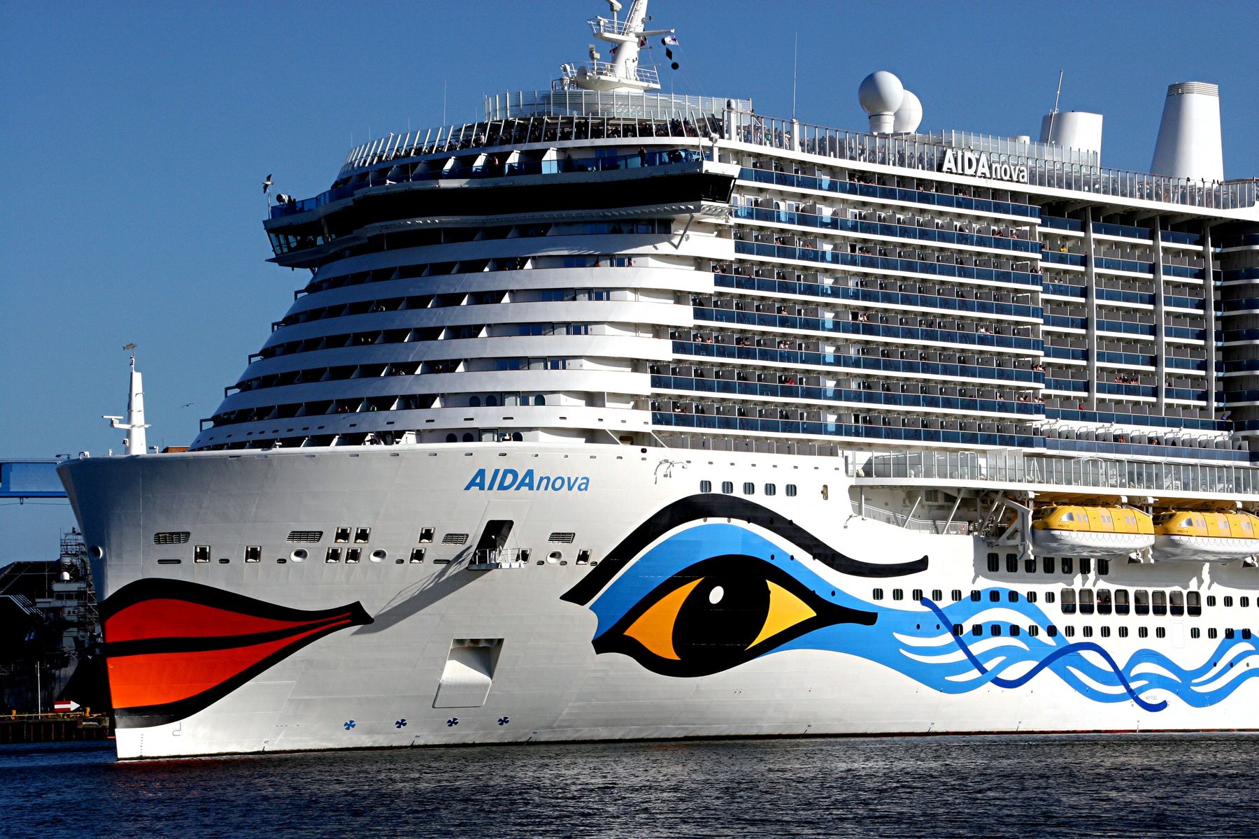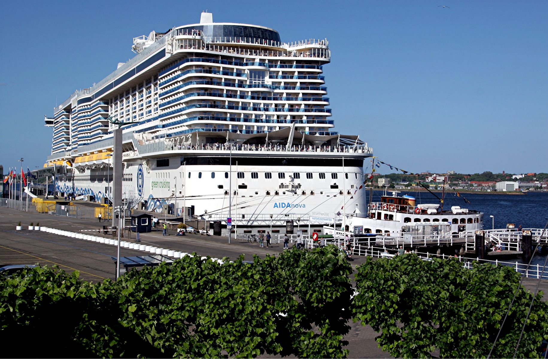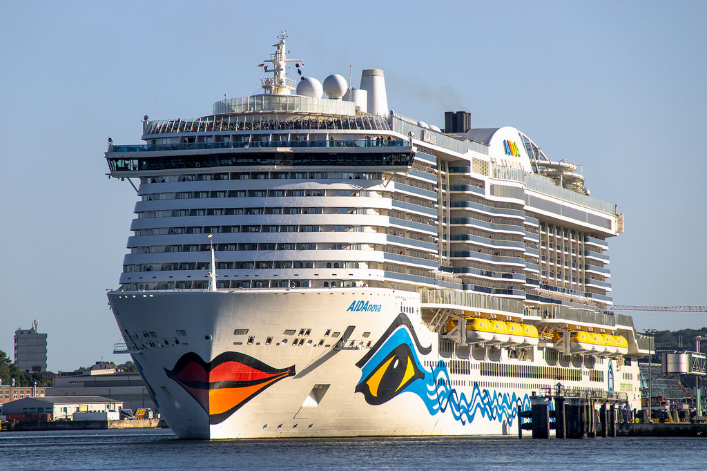 Die AIDAluna hat mit dem Bug zur Flaniermeile "Kiellinie" auf dem "Teller" gedreht