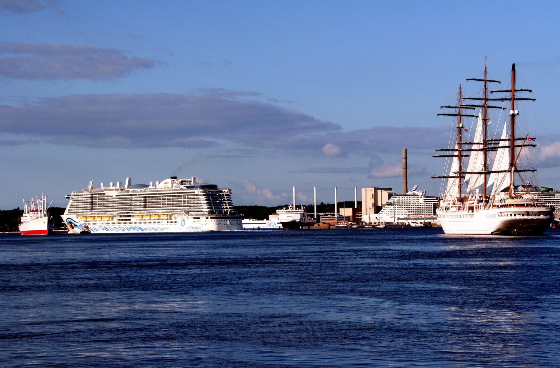 Die AIDAnova während ihrer Revierfahrt auf der "Kieler Förde" neben der "Cap San Diego"