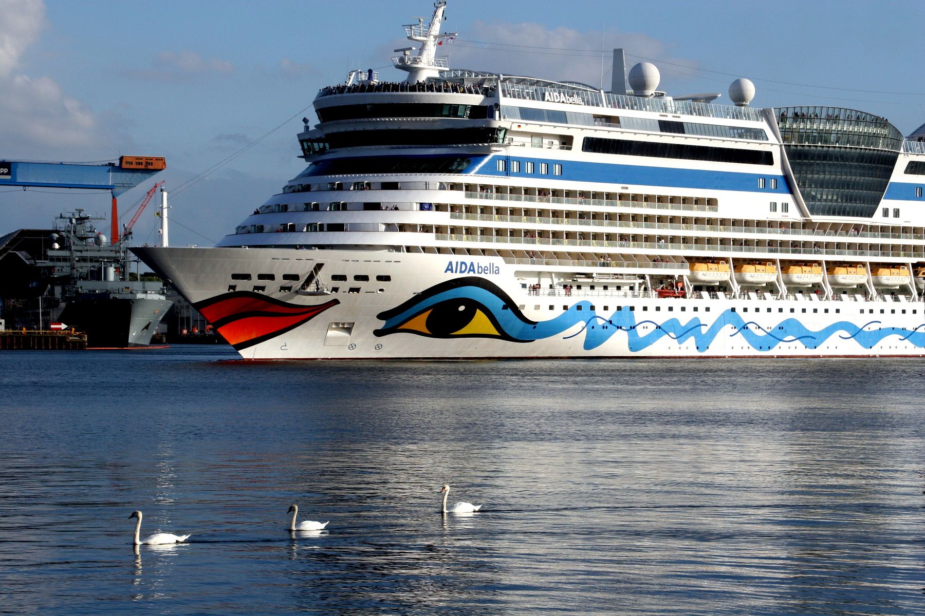 Die Schwäne schauen sich auch die "Revierfahrt" der AIDAbella auf der "Kieler Förde" an