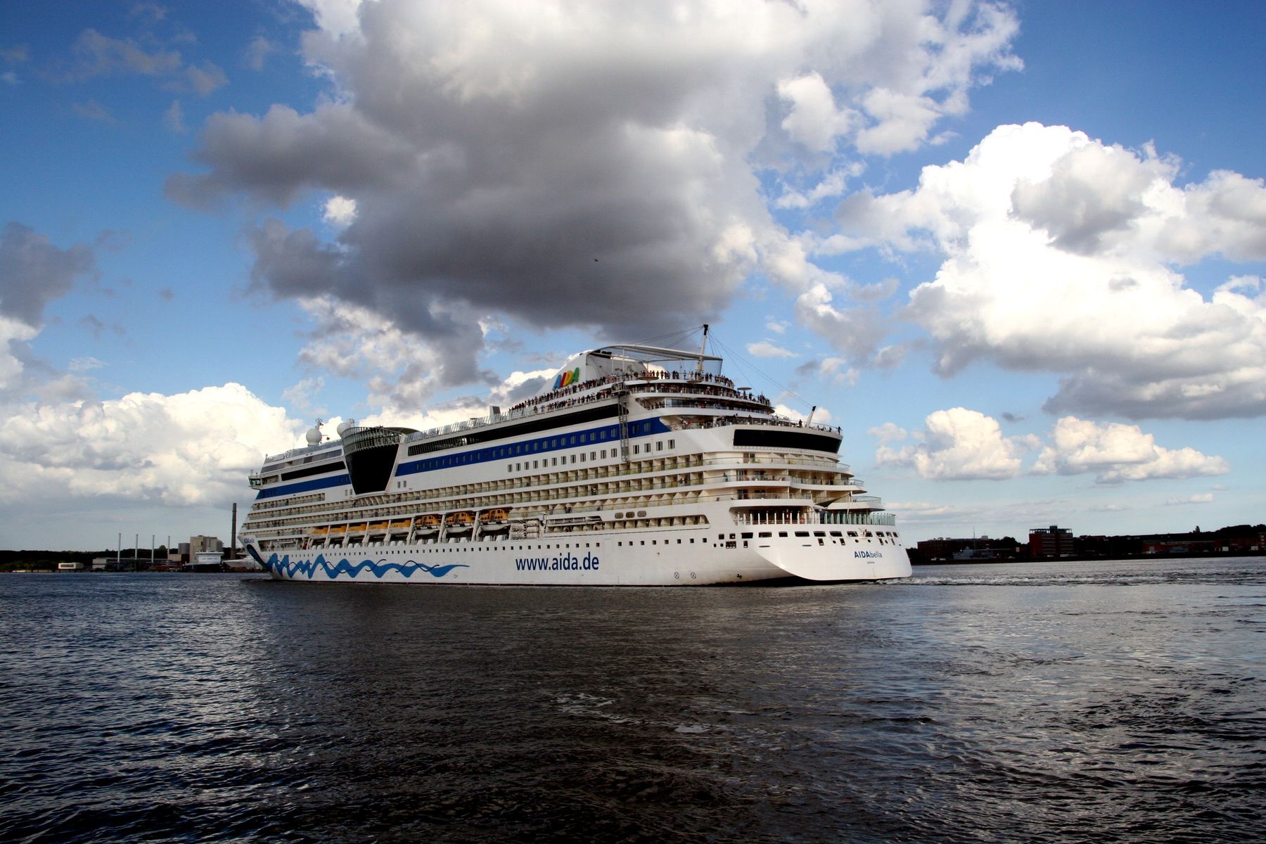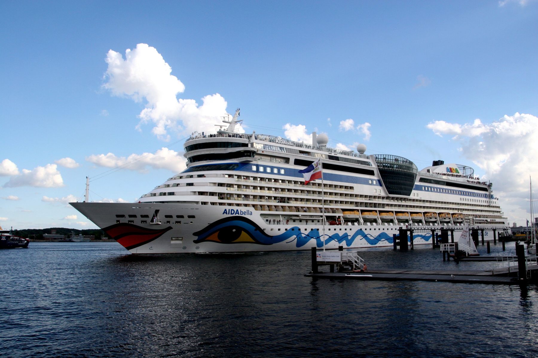Die AIDAbella fährt um 18:09h ihr Auslaufmanöver auf der "Kieler Förde" unter einem azurblauen Himmel mit Schönwetterwolken