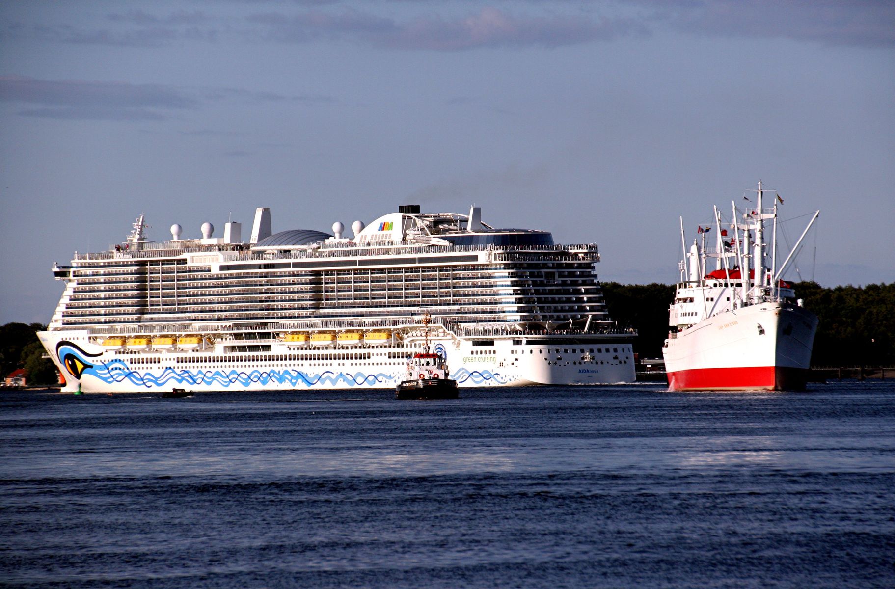 Die AIDAnova während ihrer Revierfahrt auf der "Kieler Förde" neben der "Cap San Diego"