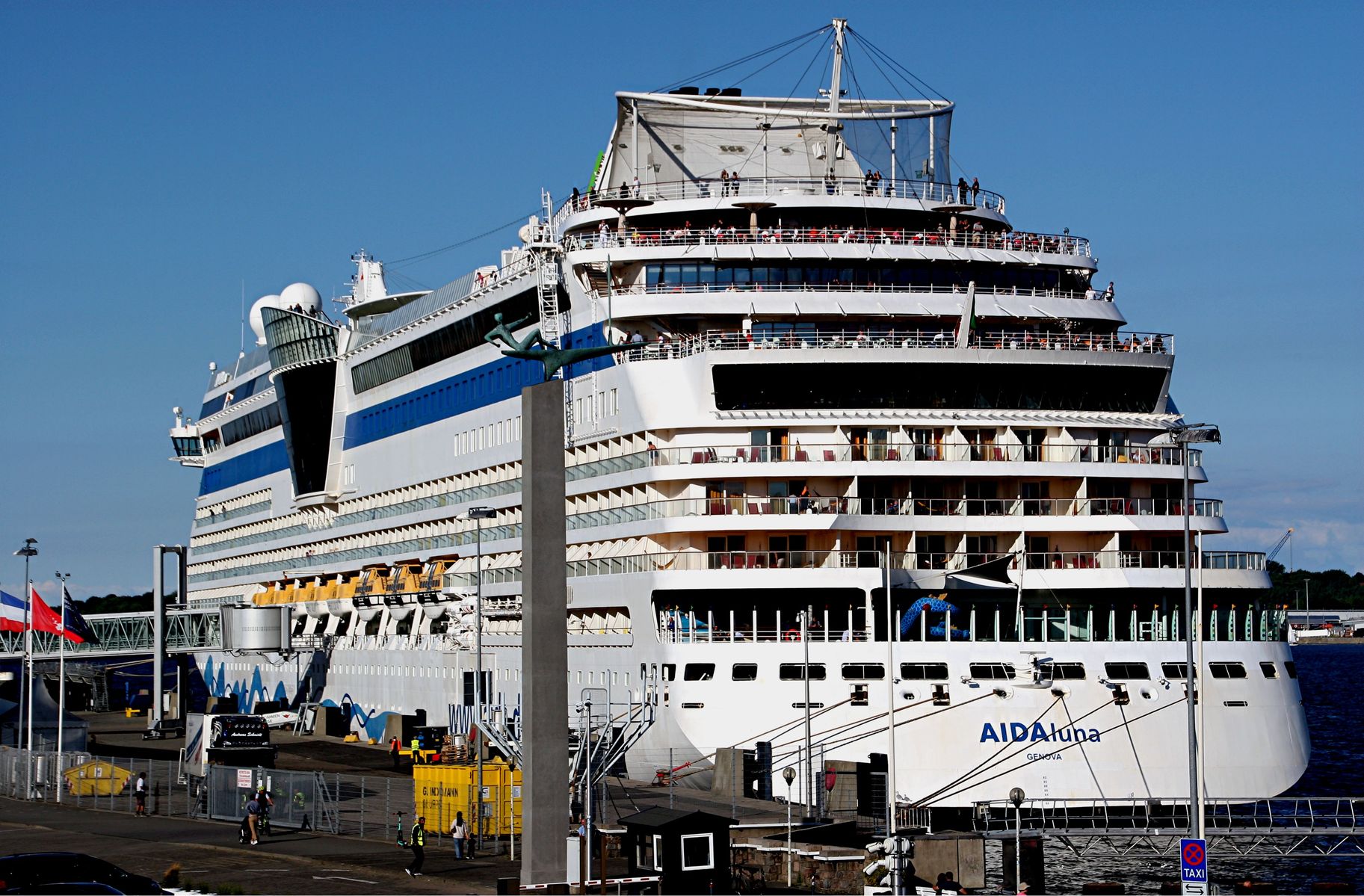 An Oberdeck genießen zahlreiche Passagiere ihre "Revierfahrt" mit der AIDAluna auf der "Kieler Förde"