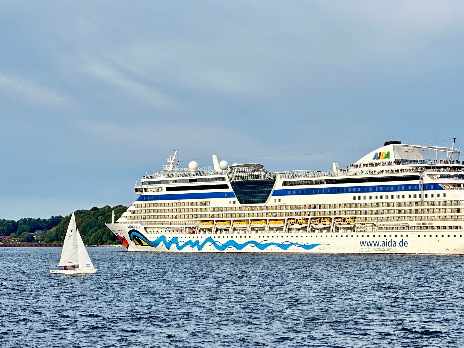 Die AIDAbella fährt am 01.05.2025 pünktlich um 17:00h ihr Auslaufmanöver auf der "Kieler Förde"