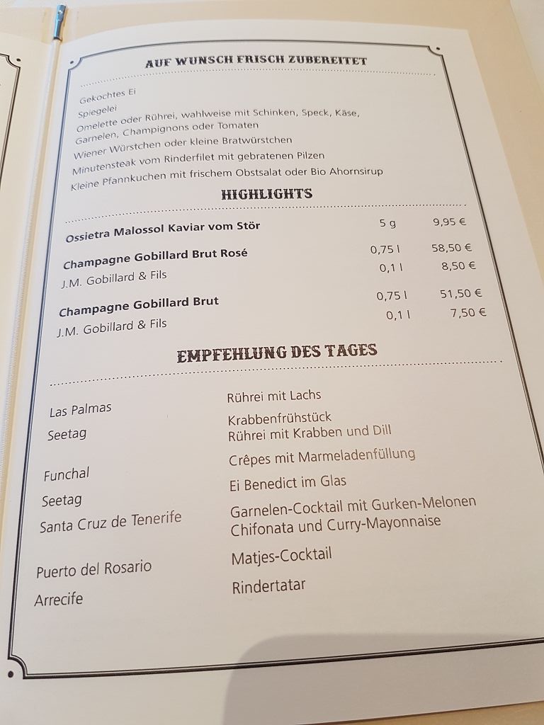 Gute Nachrichten: Wir haben mittlerweile für Euch von der Presseabteilung die Erlaubnis zur Veröffentlichung der Speisekarten bekommen können. Die Bitte von Aida lautet jedoch, dass jeweils das Datum der Aufnahme dazu kommt. Schließlich können sich Speisekarten auch mal ändern. Also freuen wir uns auf Eure Fotos der Speisekarten. Unser @el-capitano müsste da eigentlich auch noch was in seiner Schatzkiste haben...