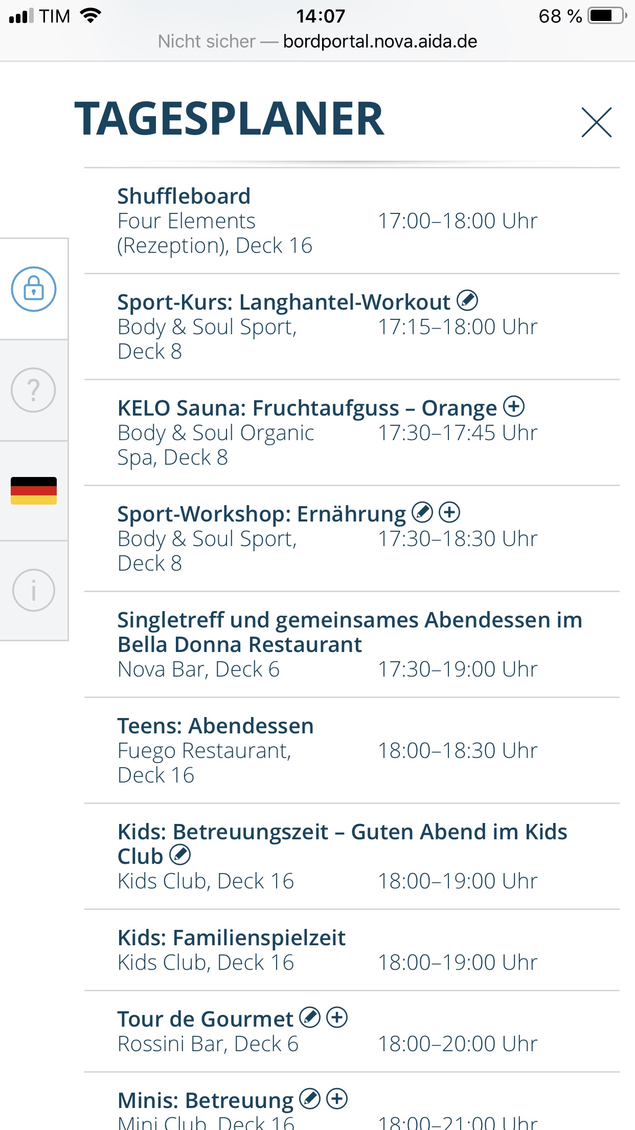 Also Zigaretten gibt's auf der Nova nur auf See und dann auch nur maximal 1 Schachtel pro Person bzw. Karte und nur an den Bars, nicht in den Shops. Kosten glaub ich ca. 3,50€.. in den italienischen Häfen sind die Zigaretten wohl wegen rechtlichen Gründen (da AIDA ja unter italienischer Flagge fährt) ganz verboten.