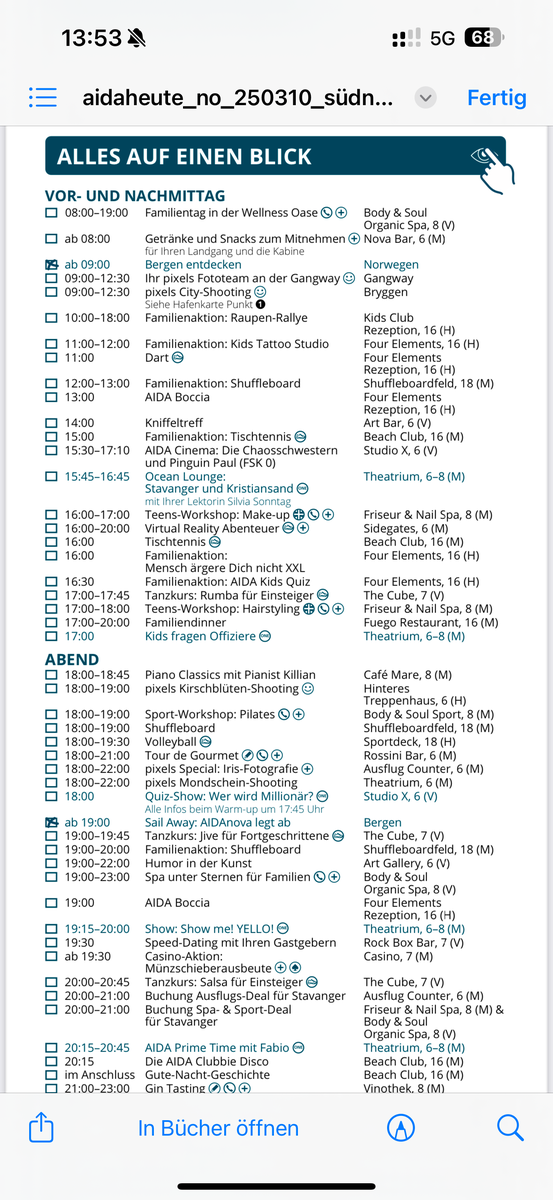 Desweiteren wollte ich fragen ob jemand von der aktuellen Tour 1-2 Aida heute einstellen kann so kann ich schonmal nach den Öffnungszeiten schauen und was wir sinnvoller Weise machen können sollte unsere Kabiene noch nicht fertig sein. Das Handgepäck nimmt man sicher die ganze zeit mit da wollte ich noch kein schiffsrundgang machen.