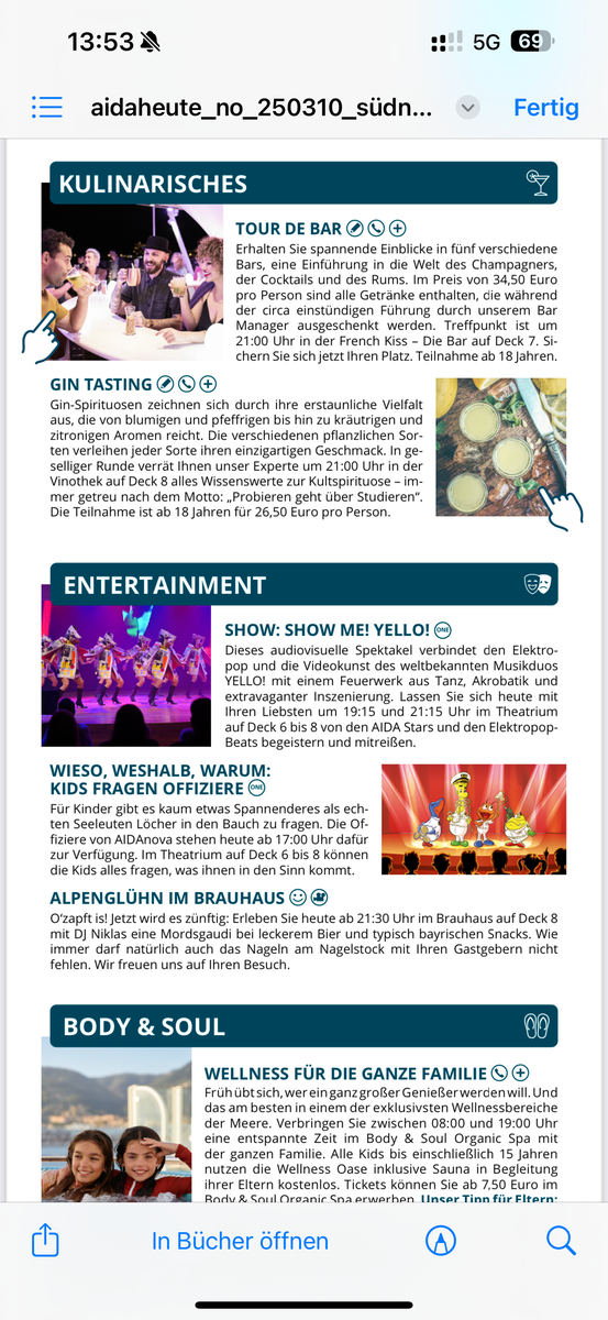 Das du das mit den Spielen erwähnt hast find ich gut. Wir spielen gerne irgendwelche Gesellschafts Spiele /Kartenspiele und dachte schon das sollte man lieber nur auf der Kabiene machen weil es doof aussieht. Nach 15 Jahren ist das unser erster gemeinsamer Urlaub ohne Kinder sozusagen die nachgeholten Flitterwochen. Da hat man dan auch mehr vom Tag und will auch nicht abends um 20 Uhr ins Bett.😅