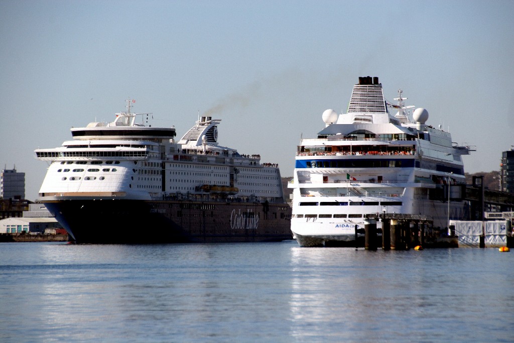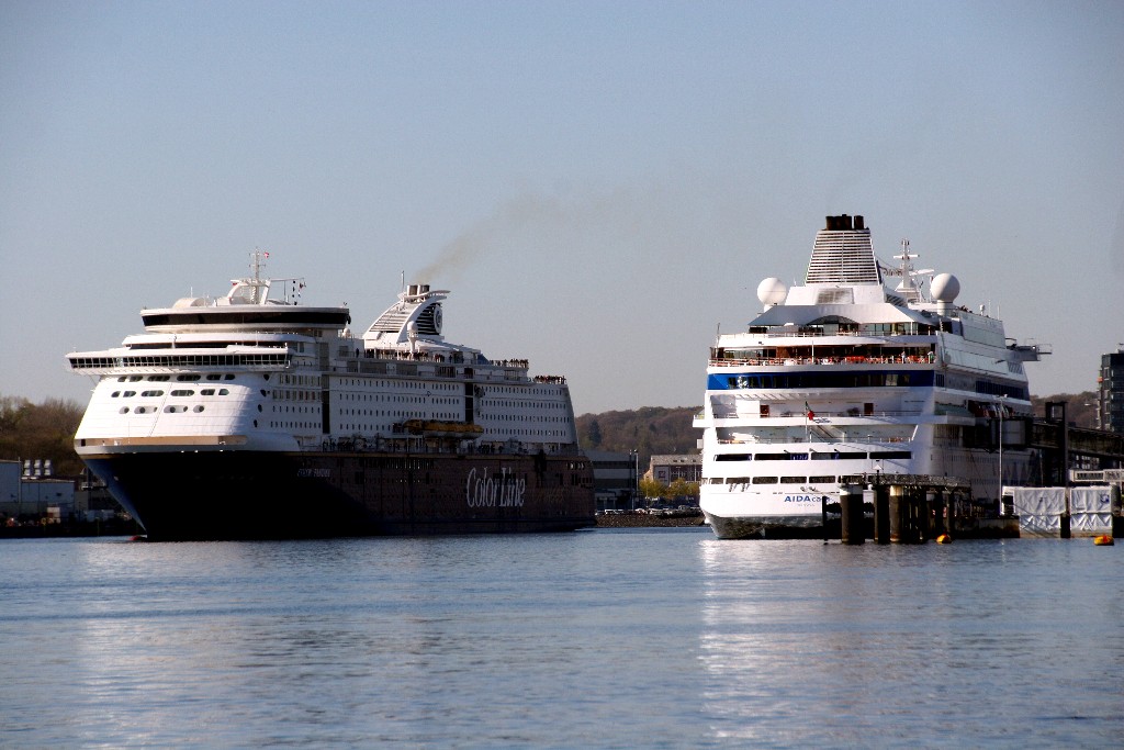 Die Color Fantasy fährt um 09:51h in Höhe der AIDAcara am Ostseekai (LP27) ihr Einlaufmanöver zum Norwegenkai