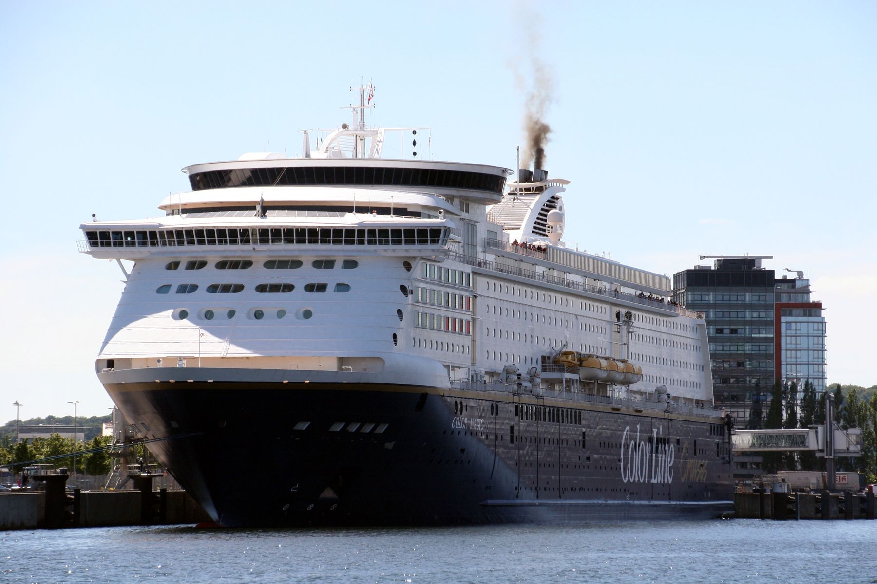 die Kreuzfahrtfähre "Color Magic" wartet am Norwegenkai mit einem kräftigen "Heizergruß" auf ihr Auslaufmanöver