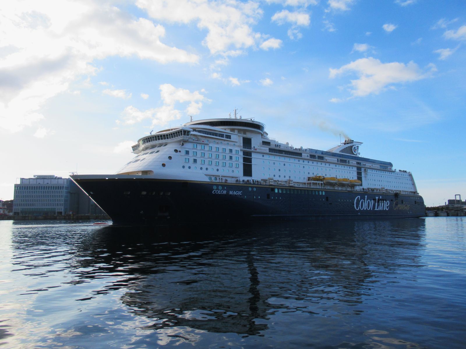 Die "Color Magic" fährt unter einem azurblauen Himmel zum Norwegenkai