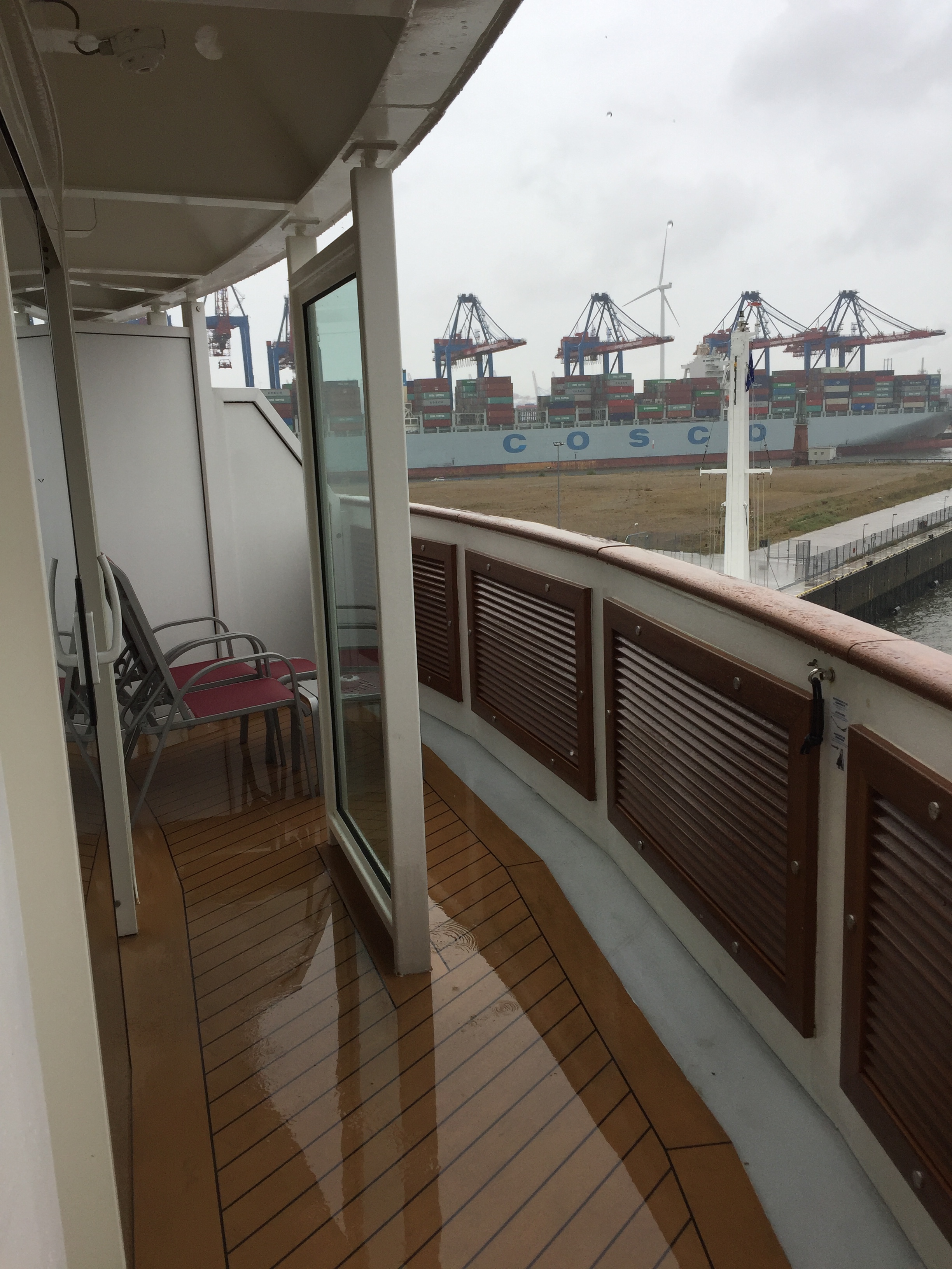 Balkon mit Blick in Fahrtrichtung bedeutet natürlich auch viel Wind! Bei den Temperaturen die wir hatten war das dann was kühl... aber das haben wir gerne in Kauf genommen für den Blick nach vorne über den Bug hinweg.