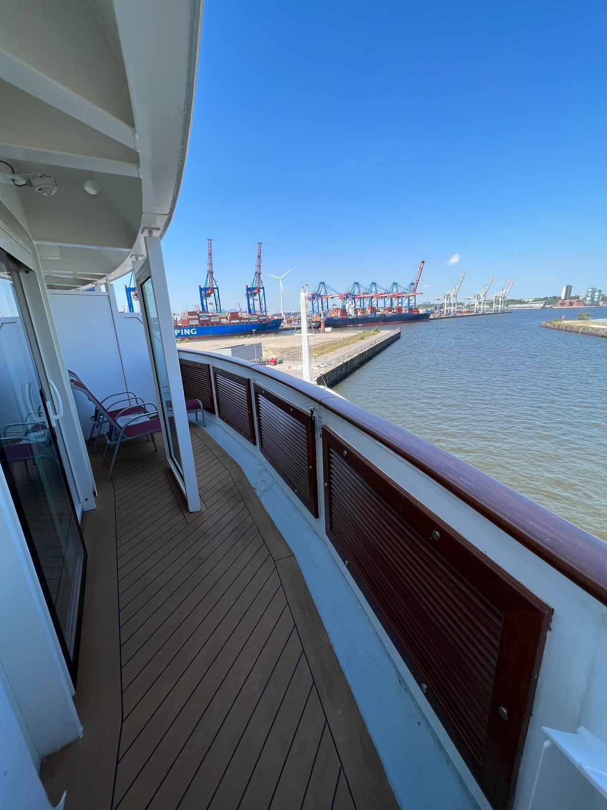 Balkon mit Blick in Fahrtrichtung bedeutet natürlich auch viel Wind! Bei den Temperaturen die wir hatten war das dann was kühl... aber das haben wir gerne in Kauf genommen für den Blick nach vorne über den Bug hinweg.