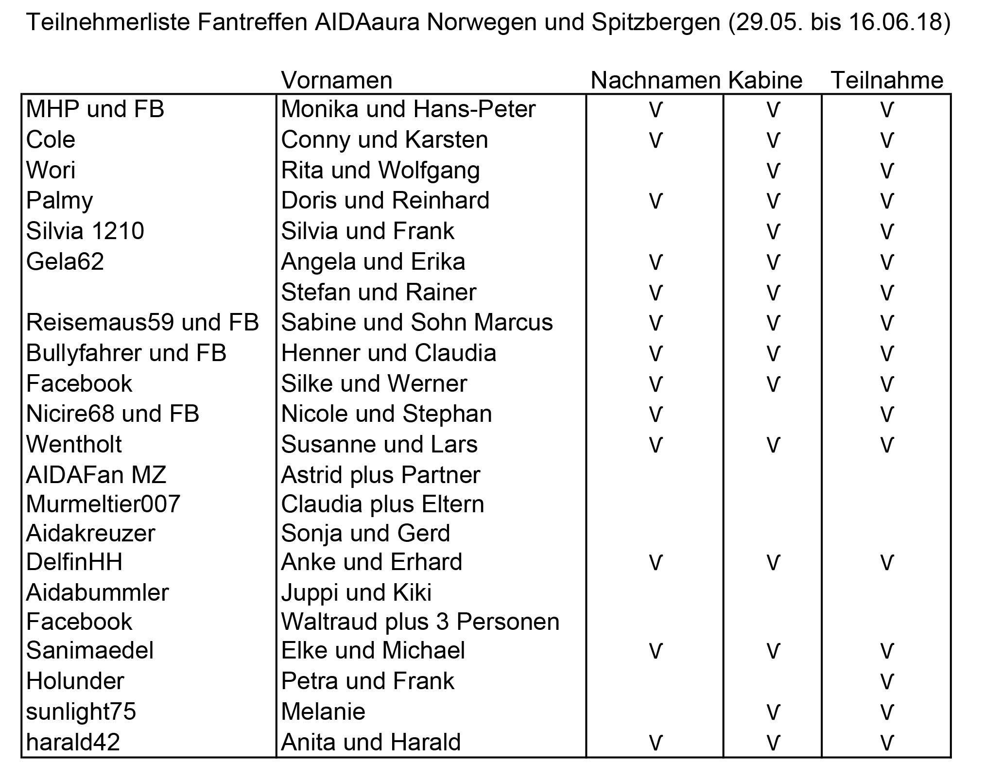 ein kleines Update zum Fantreffen. Anbei der letzte Stand meiner Liste. Aus Datenschutzgründen habe ich Nachname und Kabine nur mit Haken dargestellt, wo ich sie bekommen habe. Dadurch, dass einige sowohl hier als auch bei Facebook (FB) vertreten sind, bitte ich mit Fehler zu melden. Ich möchte alle bitten, ihren Teilnahmewunsch bis zum 5. Mai mir per PN zukommen zu lassen, damit ich die Teilenehmerzahl dann an AIDA schicken kann.Vornamen Nachnamen Kabine Teilnahme MHP und Facebook Monika und Hans-Peter Ѵ Ѵ Ѵ Cole Conny und Karsten Ѵ Ѵ Ѵ Wori Rita und Wolfgang Ѵ Palmy Doris und Reinhard Ѵ Ѵ Ѵ Silvia 1210 Silvia und Frank Ѵ Ѵ Gela62 Angela und Erika Ѵ Ѵ Ѵ Stefan und Rainer Ѵ Ѵ Ѵ Reisemaus59 und FB Sabine und Sohn Marcus Ѵ Ѵ Facebook Henner Ѵ Ѵ Facebook Silke und Mann Ѵ Ѵ Nicire68 Nicole und Stephan Ѵ AIDAFan MZ Astrid plus Partner Murmeltier007 Claudia plus Eltern Aidakreuzer Sonja und Gerd Bullyfahrer 2 Personen DelfinHH Anke und Erhard Aidabummler Juppi und Kiki sunlight76 Melanie Facebook Waltraud plus 3 Personen Facebook Nici und Stefan Reetz Ѵ Sanimaedel sunlight75 harald42 Anita und Harald -
