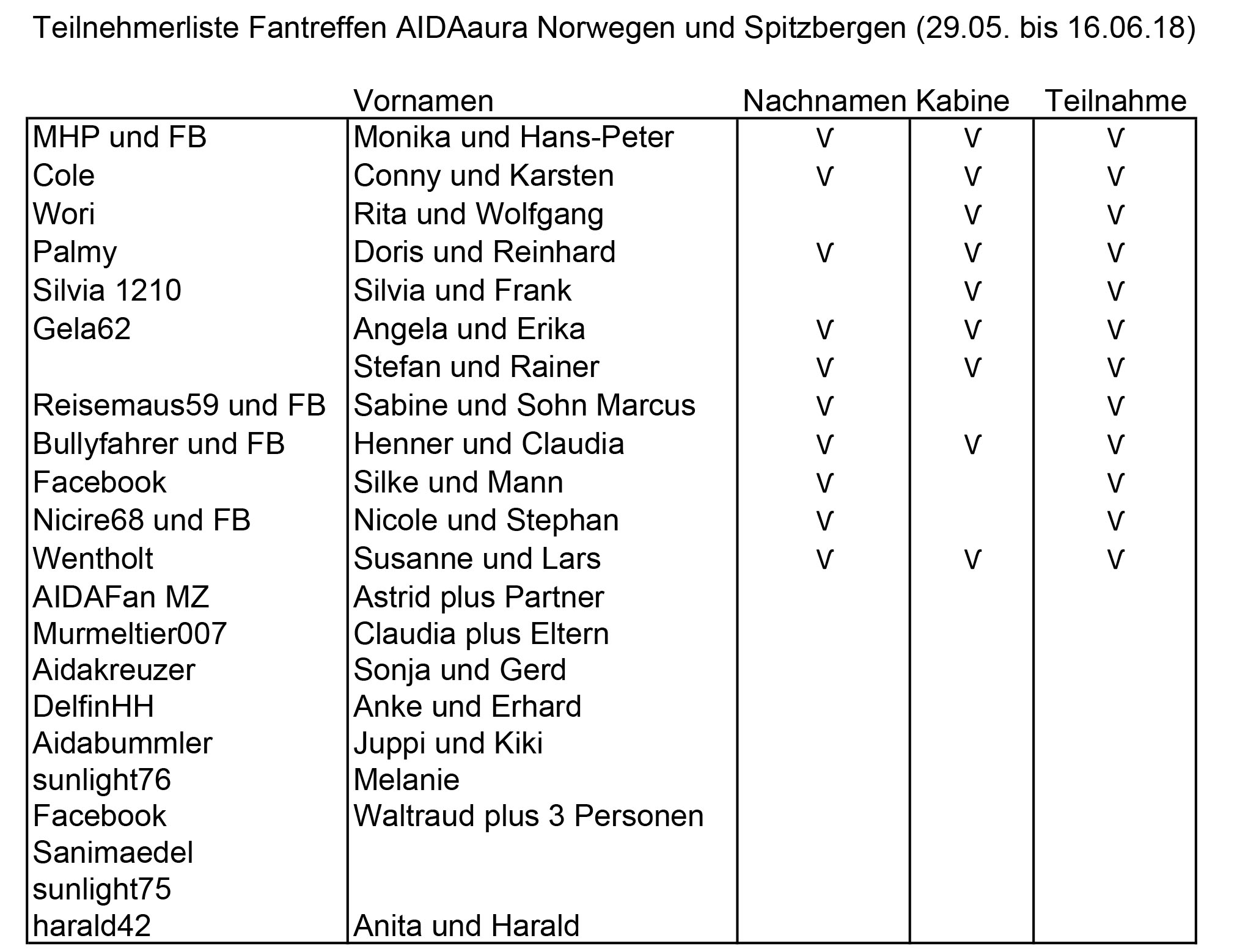 ein kleines Update zum Fantreffen. Anbei der letzte Stand meiner Liste. Aus Datenschutzgründen habe ich Nachname und Kabine nur mit Haken dargestellt, wo ich sie bekommen habe. Dadurch, dass einige sowohl hier als auch bei Facebook (FB) vertreten sind, bitte ich mit Fehler zu melden. Ich möchte alle bitten, ihren Teilnahmewunsch bis zum 5. Mai mir per PN zukommen zu lassen, damit ich die Teilenehmerzahl dann an AIDA schicken kann.Vornamen Nachnamen Kabine Teilnahme MHP und Facebook Monika und Hans-Peter Ѵ Ѵ Ѵ Cole Conny und Karsten Ѵ Ѵ Ѵ Wori Rita und Wolfgang Ѵ Palmy Doris und Reinhard Ѵ Ѵ Ѵ Silvia 1210 Silvia und Frank Ѵ Ѵ Gela62 Angela und Erika Ѵ Ѵ Ѵ Stefan und Rainer Ѵ Ѵ Ѵ Reisemaus59 und FB Sabine und Sohn Marcus Ѵ Ѵ Facebook Henner Ѵ Ѵ Facebook Silke und Mann Ѵ Ѵ Nicire68 Nicole und Stephan Ѵ AIDAFan MZ Astrid plus Partner Murmeltier007 Claudia plus Eltern Aidakreuzer Sonja und Gerd Bullyfahrer 2 Personen DelfinHH Anke und Erhard Aidabummler Juppi und Kiki sunlight76 Melanie Facebook Waltraud plus 3 Personen Facebook Nici und Stefan Reetz Ѵ Sanimaedel sunlight75 harald42 Anita und Harald -