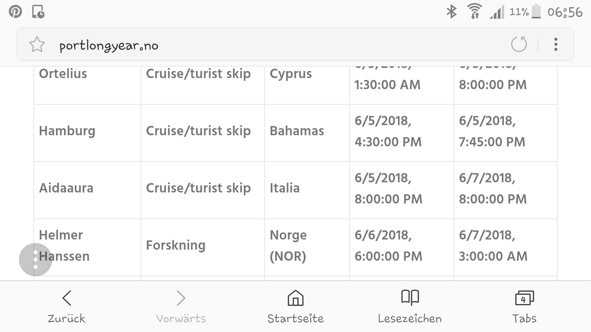 leider lässt AIDA sich mit der Antwort diesmal sehr viel Zeit. Habe noch keine Antwort bekommen. Habe dann mal veraucht, ob ich Liegezeiten am Hafen Longyearbyen finde. Und das ist mir in die Hände gefallen: