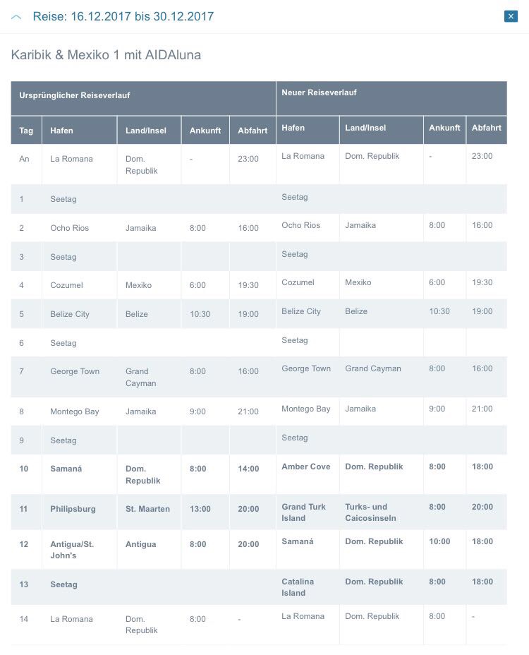 Die Änderungen siehe Anhang. Der Wegfall von Antigua und St. Maarten ist schon nicht unerheblich. Antigua wird ja zu anderen Zeitpunkten angefahren.