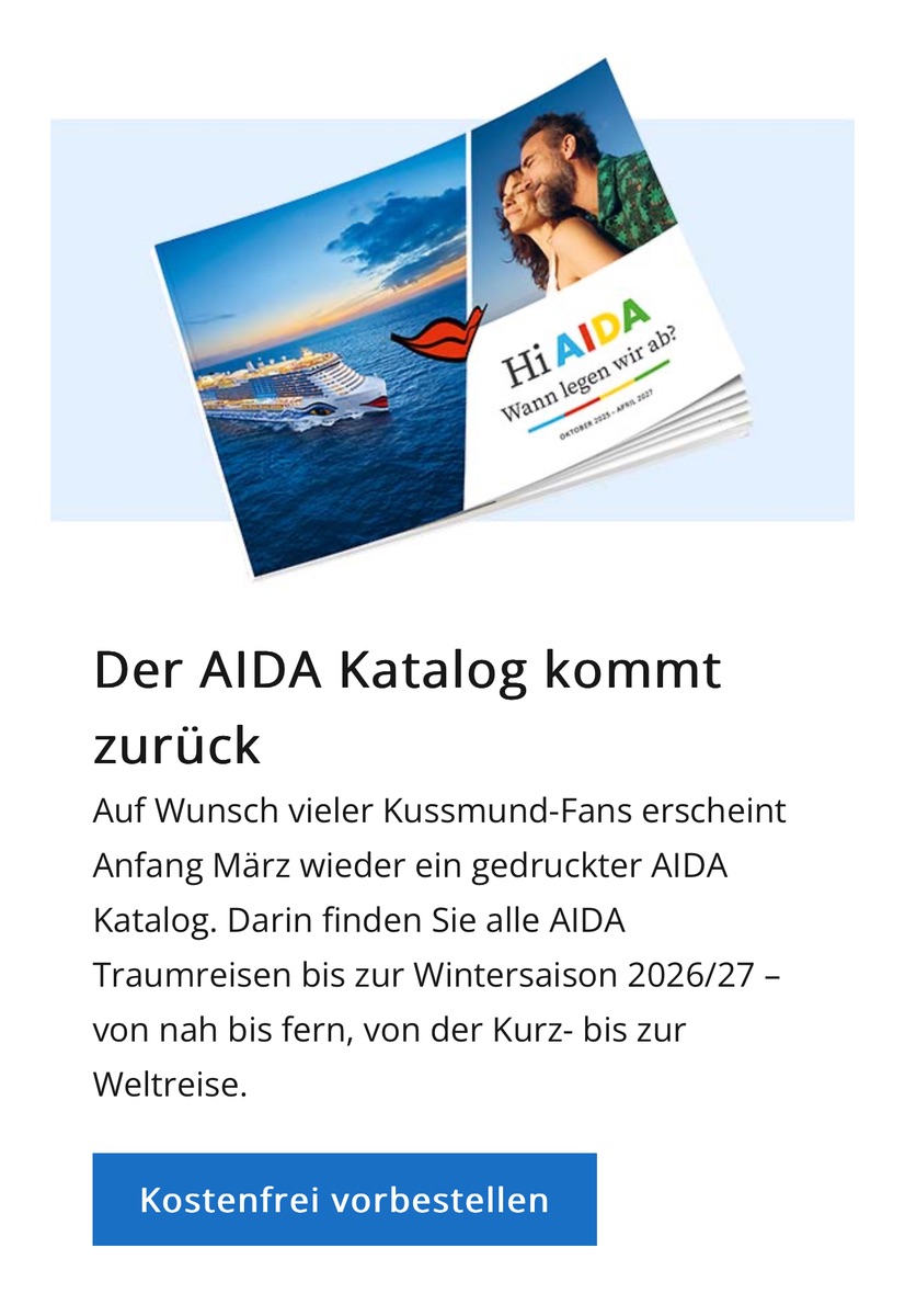 Vorbestellbar hier : https://aida.de/buchung/katalogbei mir lässt sich die Bestellung nicht durchführen. Kästchen lassen sich nicht anklicken