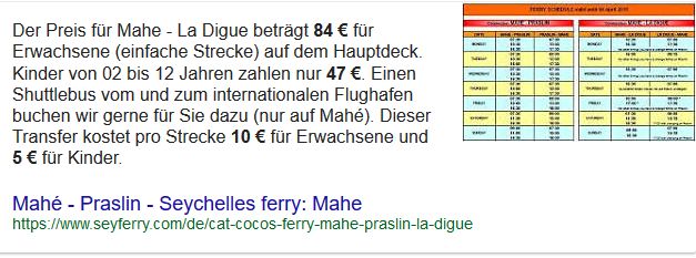 ich sehe gerade den Post von @Obermaat d.R. Für unsere Reise im November haben wir Praslin und La Digue über einen lokalen Veranstalter gebucht. Dieser bietet die Tour für 140,- Euro pro Person mit schönem Rahmenprogramm, inklusive Mittagessen (Getränke sind jedoch extra zu zahlen) an. Der Veranstalter macht einen guten Eindruck, antwortet sehr schnell und kompetent. Wenn Ihr Interesse an dem Programm habt, bitte PN mit Eurer E-Mail-Adresse an mich. Ich maile es Euch gerne zu.