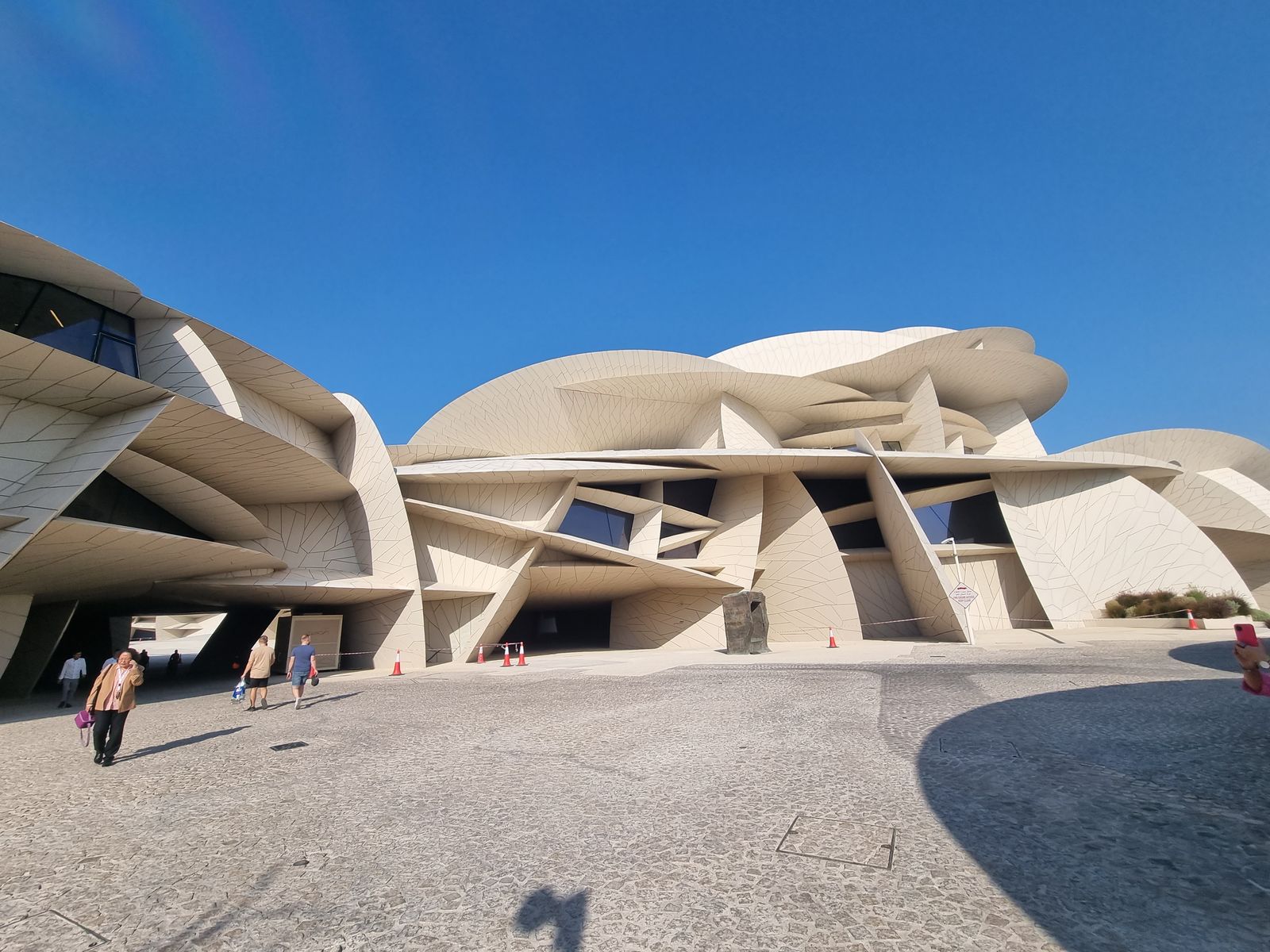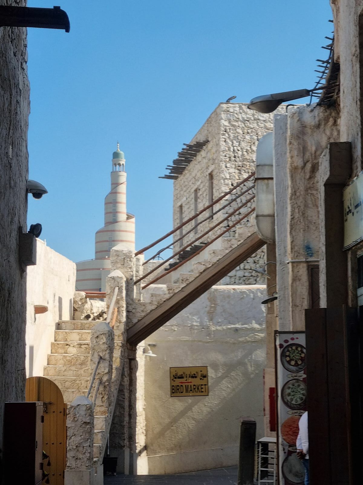 Am zweiten Tag waren wir dann zuerst in einer tollen Austellung zum Architekten I. M. Pei:, der das MIA gebaut hat und u. a. auch für die Pyramide im Louvre verantwortlich ist. Das MIA haben wir von außen besichtigt, da wir zur Imam Muhammad Ibn Abd Al Wahhab Mosque (Dohas Grand Moschee) wollten. Frauen bekommen Abajas ausgeliehen, sonst kommen wir nicht hinein. Anschließend ging es nach Msheireb zum Tram fahren und anschauen, was recht witzig war - Die Straßenbahn Doha (Msheireb Tram) ist eine Straßenbahn im Stadtteil von Msheireb von Doha, das seit 2020 der Erschließung des Stadtteils Msheireb dient. Auf einem 2,2 km langen Rundkurs werden 8 Stationen angefahren. Die Mitfahrt ist kostenlos und dauert circa 30min. Über den Souk Waqif ging es dann unter Mitnahme von lokalen Süssigkeiten (Geschäft links von der Daumen-Skulptur) zurück.