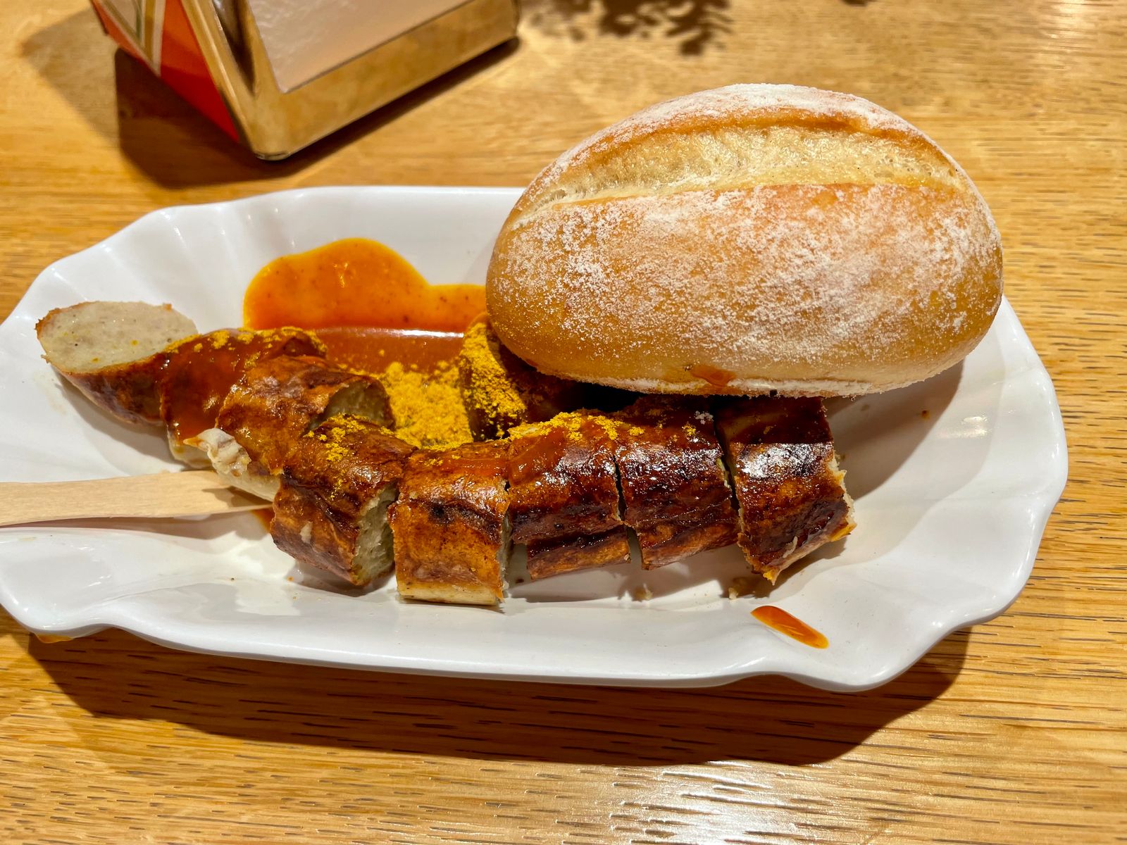 - Currywurst in verschiedenen Schärfegraden (Currypulver) mit Brötchen