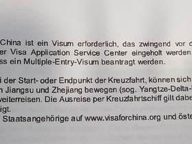 Wenn jemand, als Beispiel, nach Beendigung der Schiffstour von Shanghai noch nach Peking o.ä. reist, braucht er ein offizielles Visum für China.