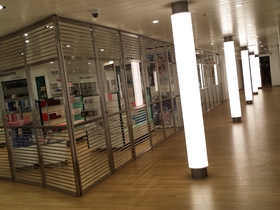 Läden geöffnet. Alles ohne Unterbrechung. Trennwände sind auf die Seite geschoben und verborgen hinter Wänden