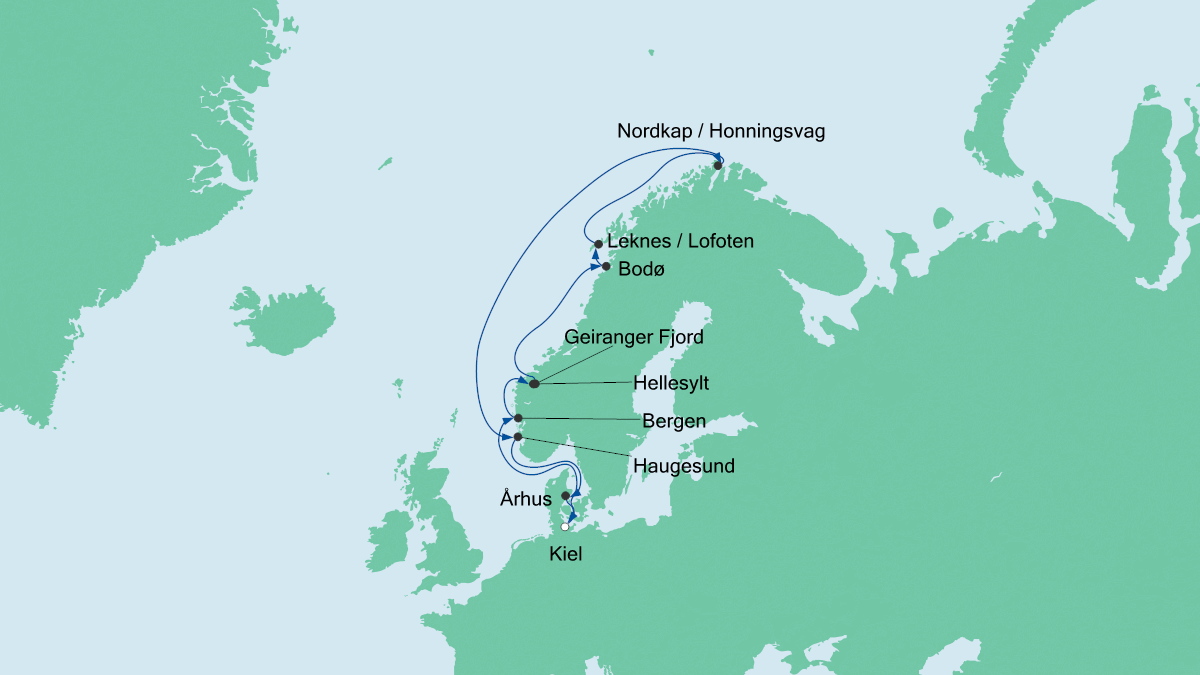 Ja, Haugesund ist zwar auf der Karte eingezeichnet, aber wir legen dort nicht an. Es geht von Kiel nach Bergen und dann in den Geirangerfjord. Guck noch mal auf den Zeitplan, da steht´s drin. Aber es stimmt, alle anderen Häfen auf der Karte werden angelaufen, das ist dann etwas verwirrend mit Haugesund.
