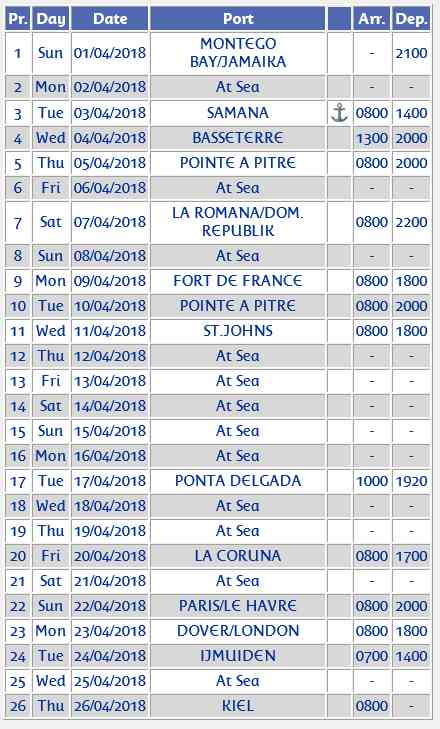 Hallo - nachdem wir von unserer Transreise mit der luna zurück sind, haben wir uns ebenfalls an Aida gewendet. Wir brachten zum Ausdruck, dass diese Routenanpassung dem Charakter der Selektionsreise widerspricht. Mal sehen, ob und wie Aida reagiert. Grüße zum 1.Mai vom Kaiserstuhl Carmen und Rainer