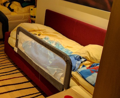 Auf unserer Kabine auf der prima konnte man die „Matratze“ vom Sofa auch runter nehmen. So hatten wir es gemacht. Unserer dreijähriger hatte dann nur auf der Matratze geschlafen. Ist er nur runter gerutscht und nicht gefallen und hat dann ein paar mal auf dem Boden weiter geschlafen :) vielleicht geht das bei dem Sofa ja auch.