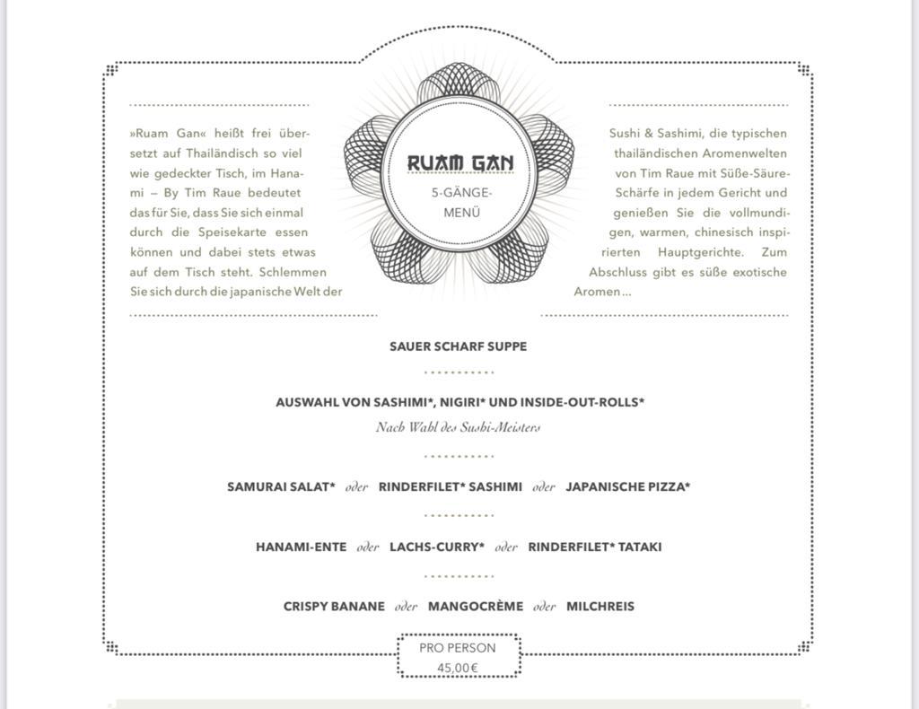 Im Hanami gibt es im Rahmen des Gourmet Paketes ein festgelegtes 5-Gänge Menü (Ruam-Gan-Menü). Wir hatten es im Juni auf der Mein Schiff 3. Da wir alles, was es gab, gerne essen, haben wir nicht versucht zu tauschen.