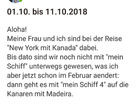 Meine Frau und ich sind bei der Reise "New York mit Kanada" mit "mein Schiff 6" dabei.