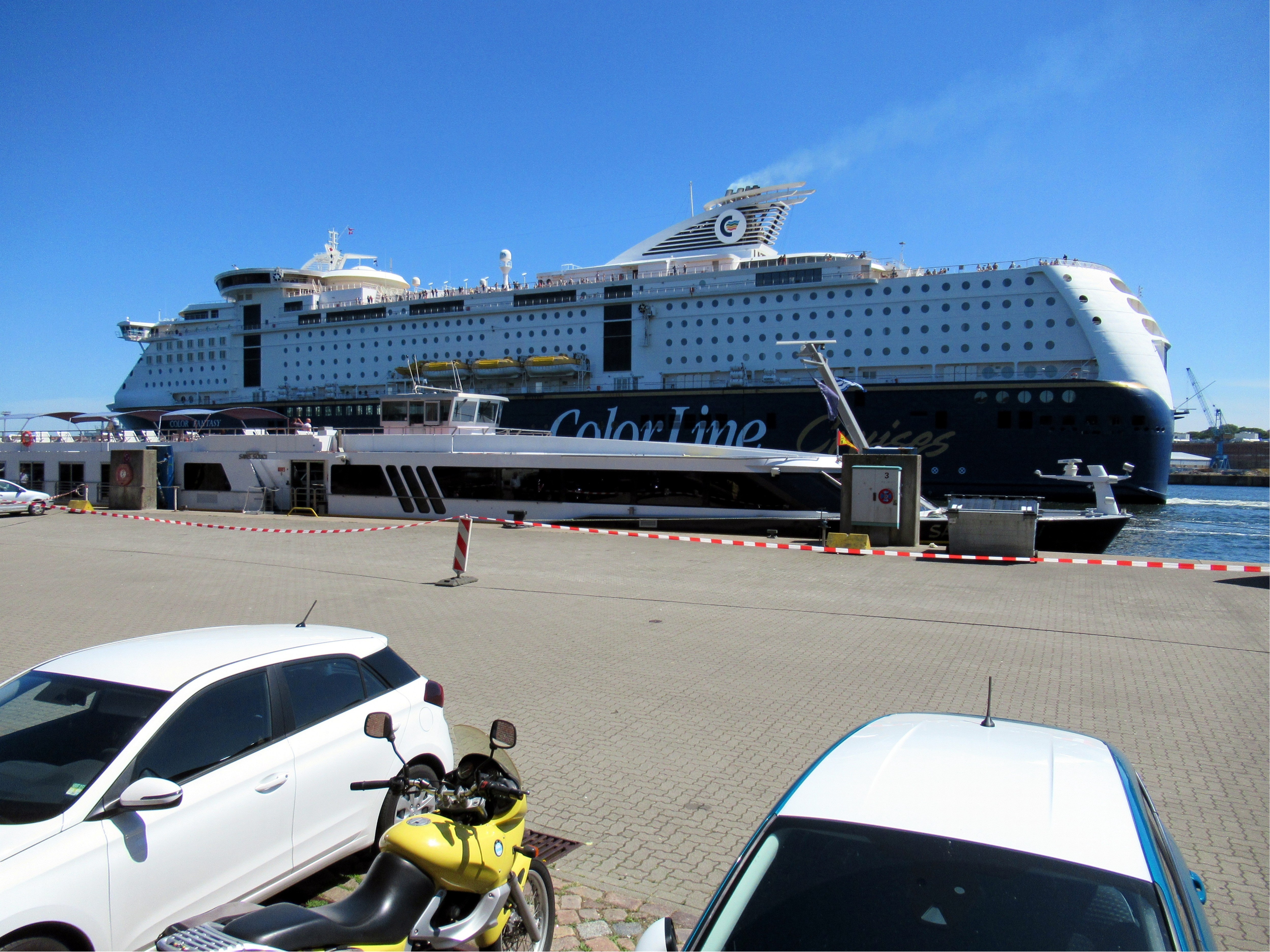 Große Kreuzfahrtfähre und kleines Flußkreuzfahrtschiff im "Kieler Hafen" auf gleicher Höhe