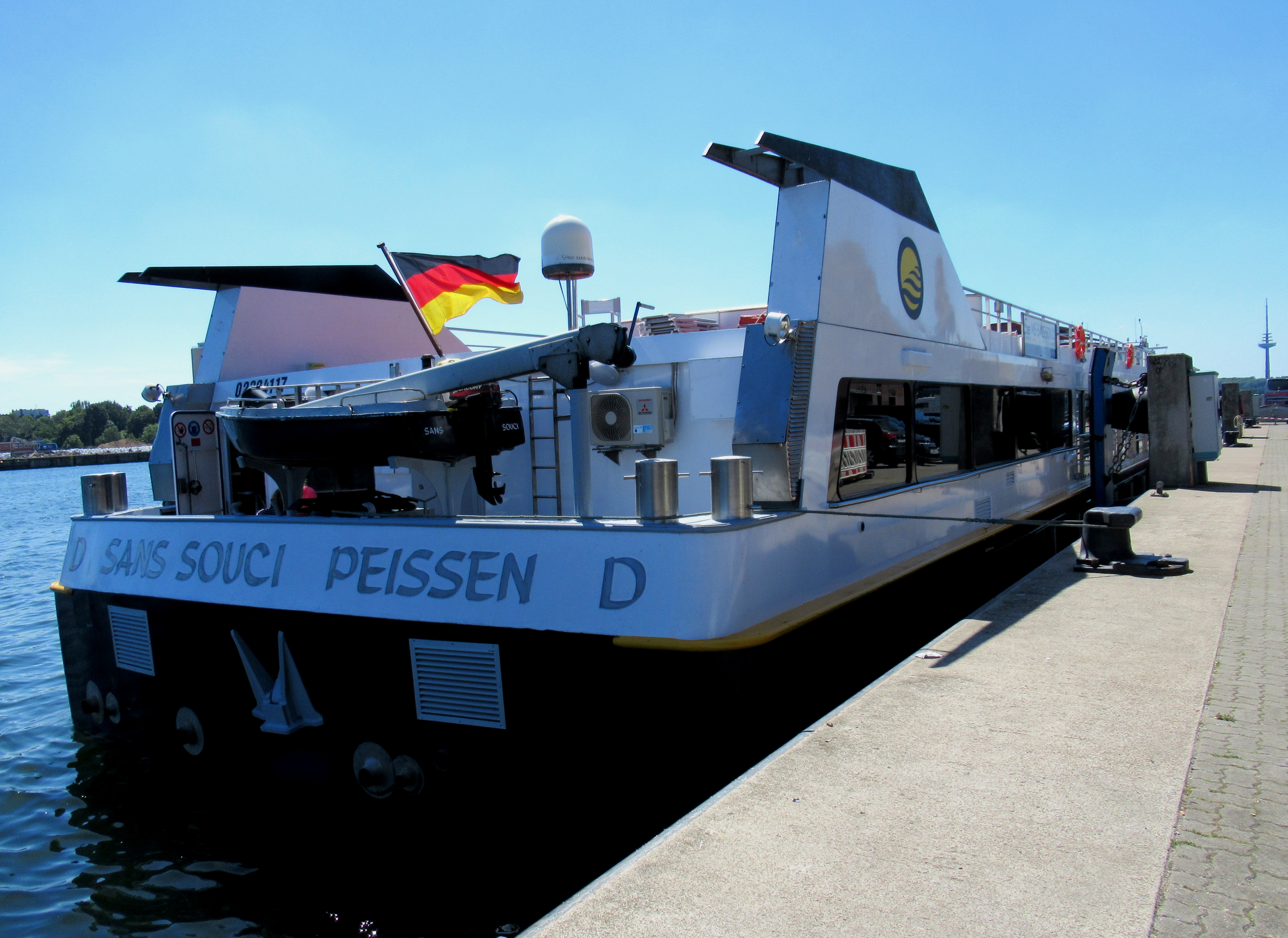 Die "Sans Souci" unter einem azurblauen Himmel am Sartorikai in Kiel