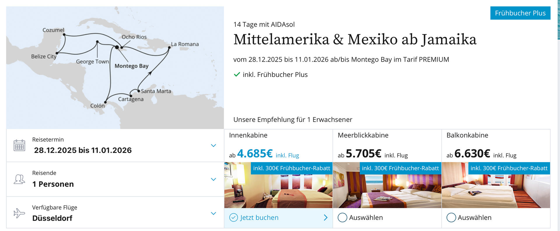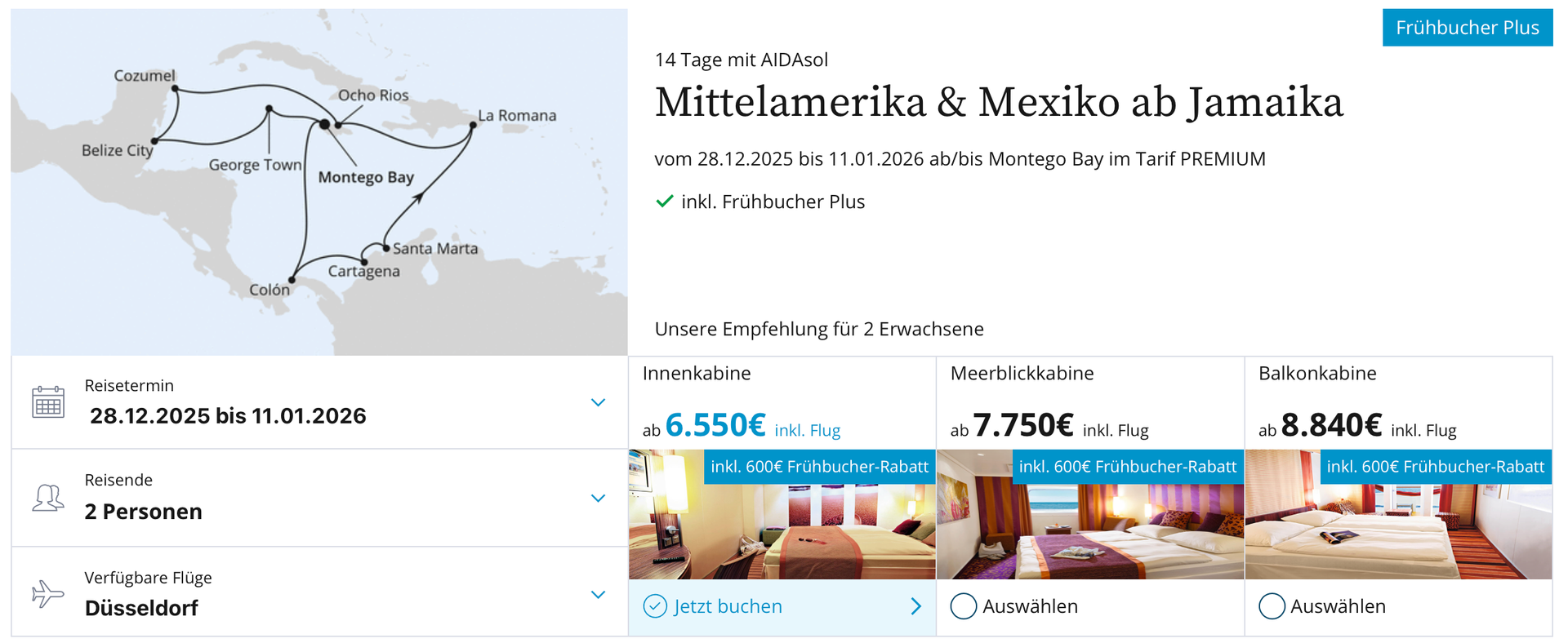 Für Innen: 2.390 Euro (IB) plus 1.100 Euro Flug Eco. Macht 6.990 Euro für zwei Personen, abzüglich 2 Mal 300 Euro Frühbucher sind es 6.390 Euro. Zu jetzt 6.450 Euro.