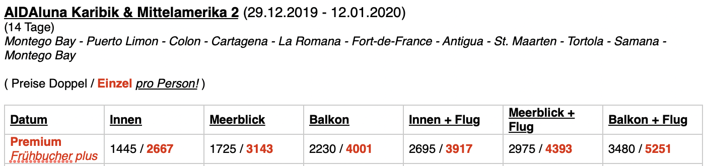 Und gerade die Reisen, die über Weihnachten/Silvester 2025/2026 in die Karibik gehen (Perla, Blu, Sol) sind Preistechnisch jenseits von gut und böse...