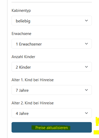 Alternativ kannst du dies auch selbst unter "Kreuzfahrt buchen" abfragen. Bitte beachte folgende Eingaben, damit dir der korrekte Preis angezeigt wird. Hier mal ein Beispiel: