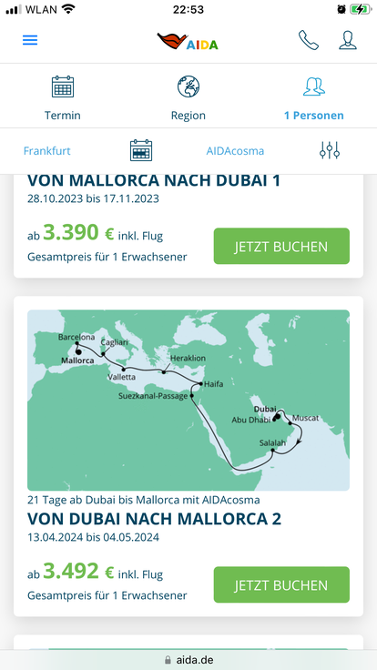 Eine 21-tägige Reise Orient-Mittelmeer für Frühjahr 2023 wird mir gar nicht angezeigt.