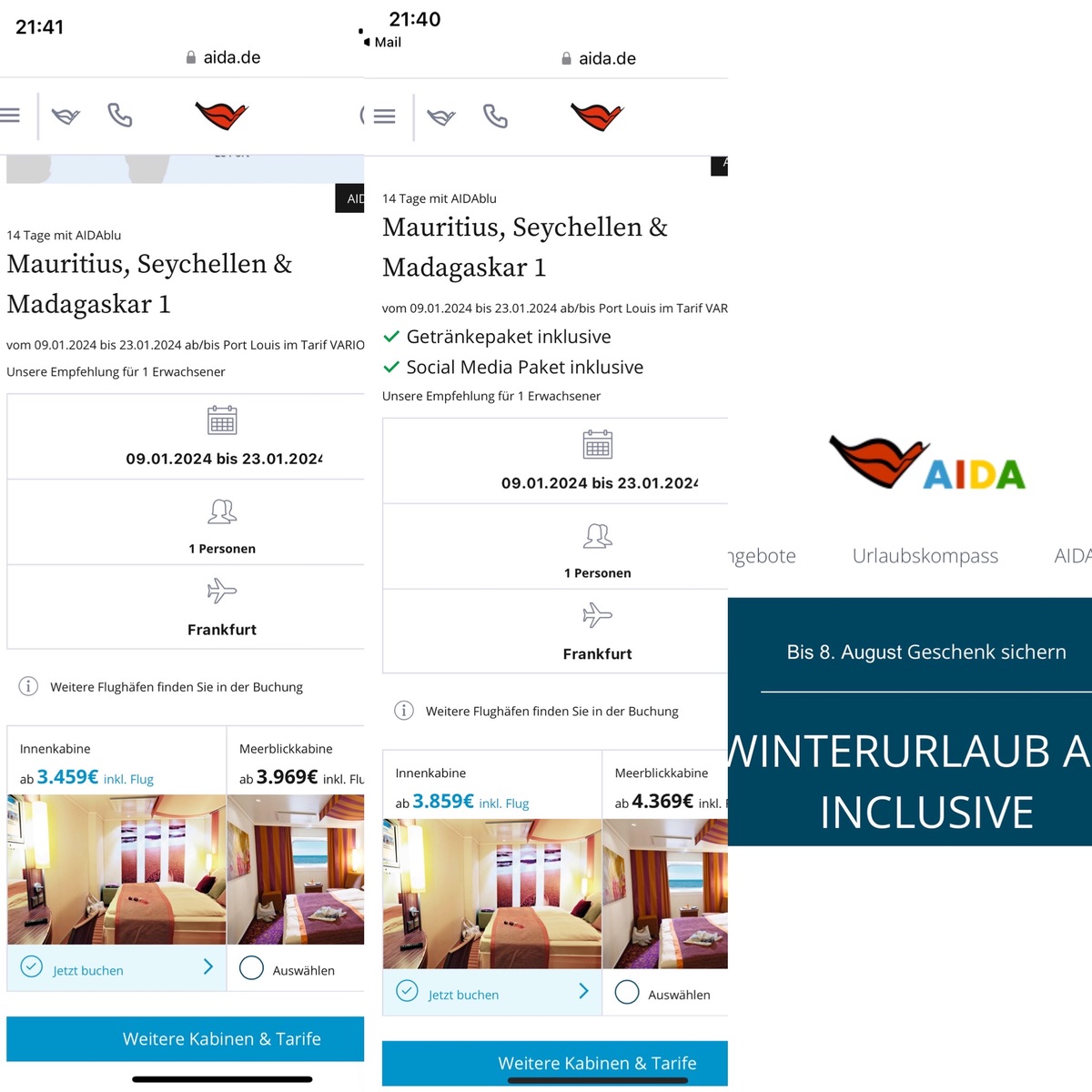 Wenn die offenbar so gut gebucht ist, dass schon die Flüge ausgehen, dann dürfte Aida eher um Nachschub bemüht sein, statt den Preis zu senken.