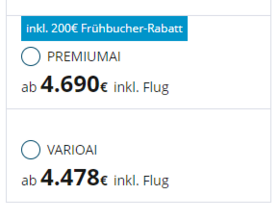 wir haben am 28.07. die Cosma Tour vom 16.-23.12. Balkon AI 749€ pro Person gebucht. Heute kostet die Tour ohne AI 799€. Flüge habe ich schon im März individuell gebucht, da wir vorher und nach auf Gran Canaria sind. Auch die Flüge sind von März bis jetzt 200€ gestiegen.