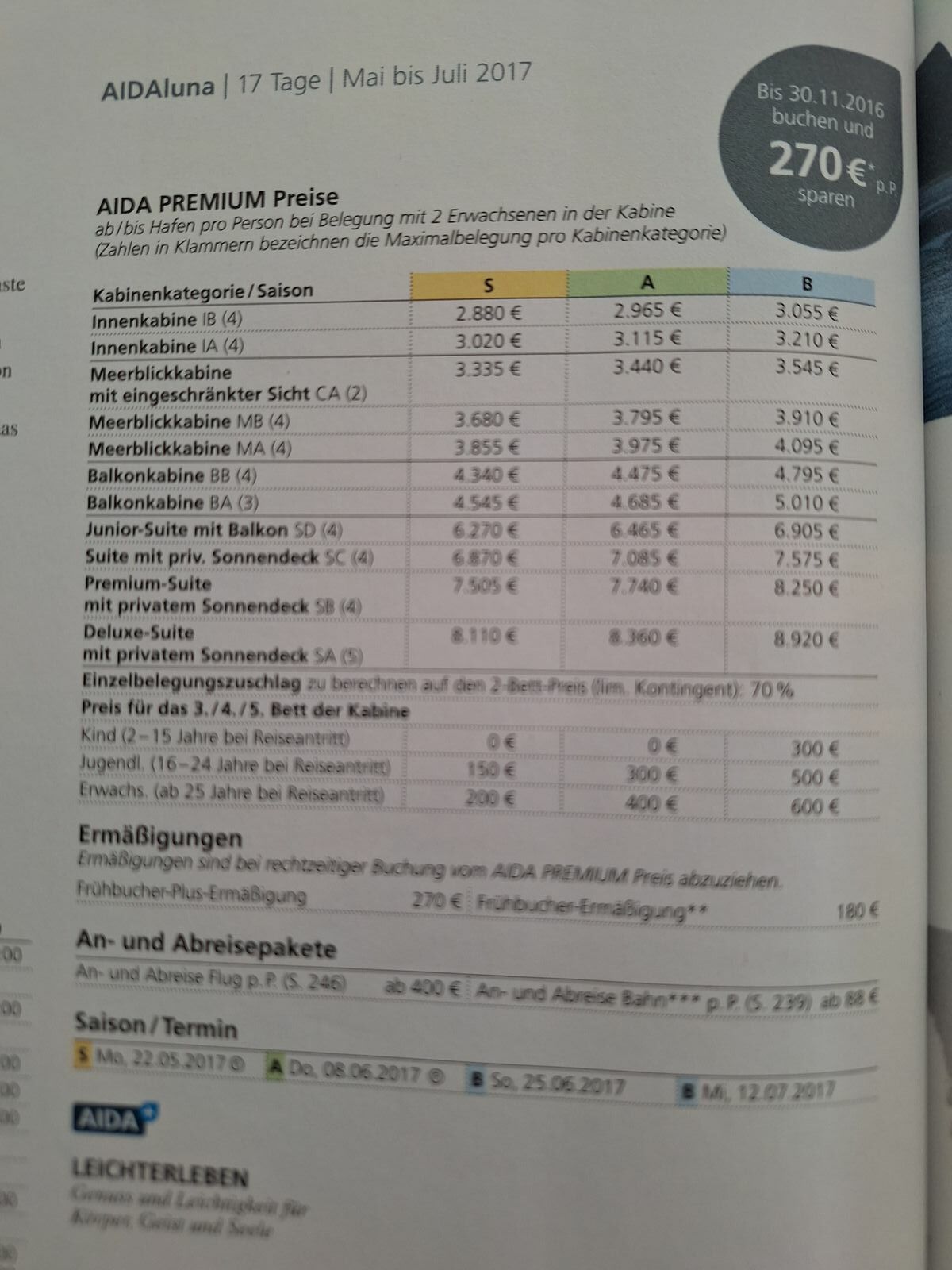 150€ pro Person und Tag in der Innenkanine ohne All-In sind schon ziemlich happig, zumal auch nur drei Bundesländer Ferien haben zu der Zeit. Bei TC sind es über die Feiertage mit All-In 120€ pro Tag, sprich die Aida Reise ist völlig überteuert und wenig verwunderlich, dass noch so viel frei ist.