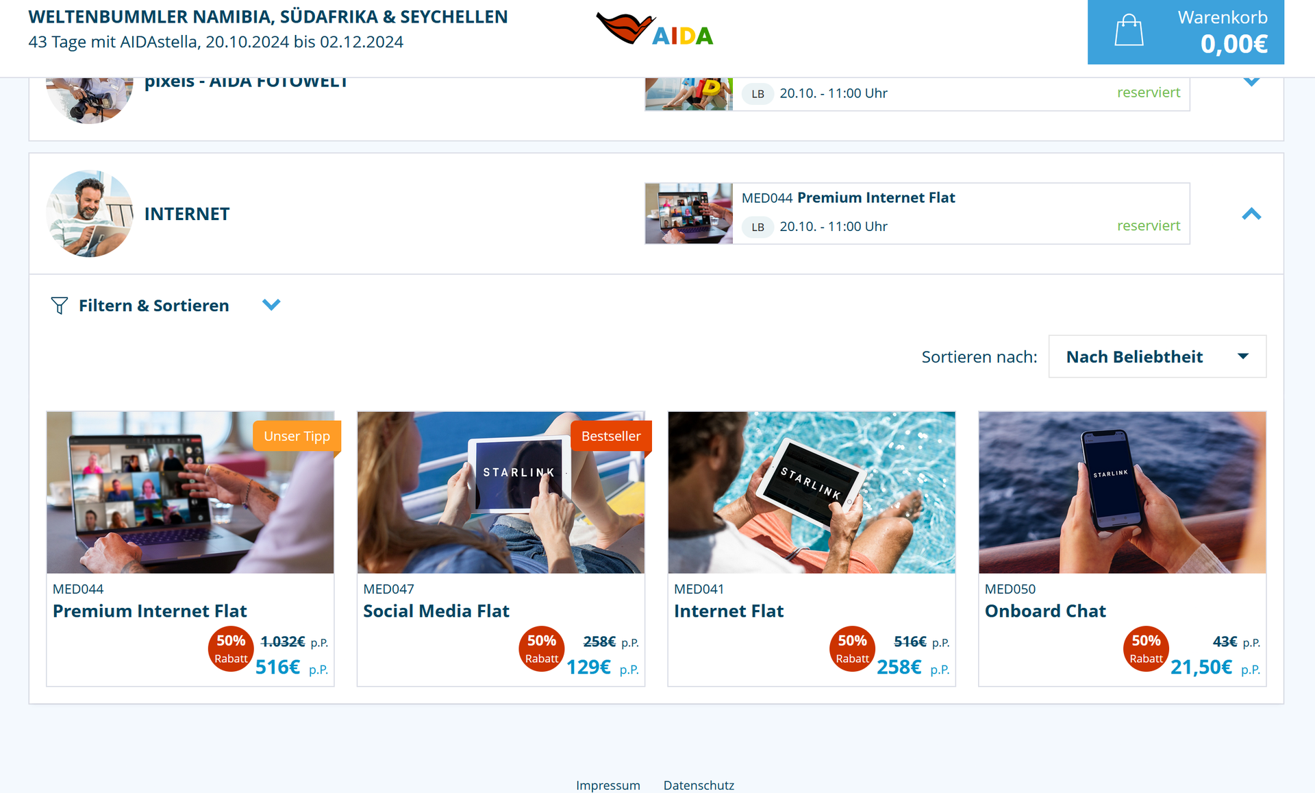 Auf meiner Reise jetzt am 14.9. gibt es den Frühbucherrabatt noch, aber auf einer Reise in Europa brauche ich das nicht, da reicht das Premium Internet und die Clubstufe ...