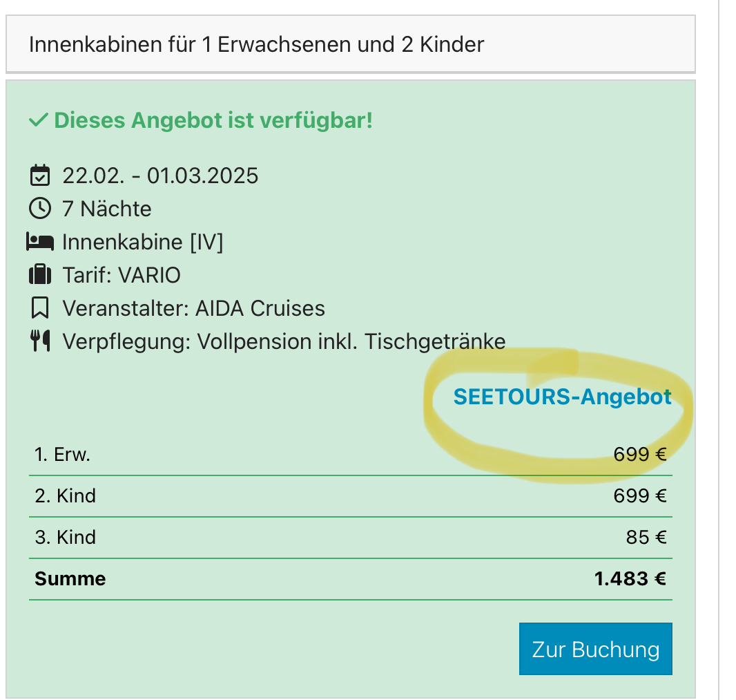 Bei Aida direkt gibt es nur Premium Preise. Dort würde die Kabine für 1 Erwachsenen und 2 Kinder 1471,00 € kosten.