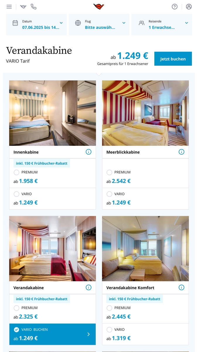 Hab gestern 11 Tage Fjorde in der Veranda für 3800 gebucht und heute 1 Tag danach einfach die Meerblick kabine um 500 Euro gefallen auf 3300 Euro für 4 Personen. 9 Tage vor Abfahrt und immernoch verzockt. Vario Angebote sind gut aber eben extrem spontan.Eine Vierbettkabine ist aber auch eine Herausforderung für Vario. Oftmals ist eine Mehrfachbelegung nicht mehr möglich, auch wenn es noch entsprechende Kabinen gibt