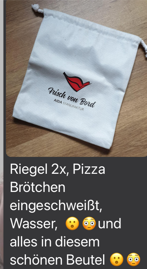 Bei dem Preis kann man sich nicht beschweren. Wobei bei Prima/Perla darf man sich die Sachen im Pier 3 Markt umsonst mitnehmen. Außer Getränke und Süsigkeiten Dachte auf der Nova wäre das in dem laden neben der Currywurst auch etwas zum mitnehmen. Hab ich aber nie benutzt da der weg zuweit war. Aber anscheinend hat Aida da auch wieder zugeschlagen um kleines Geld zu verdienen.