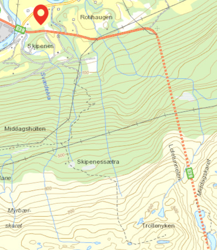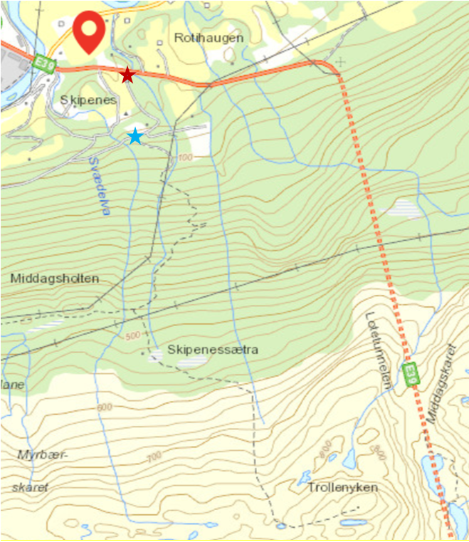 Folgendes habe ich gefunden. 1. Das PDF von der Touri-Info. Dort ist es der Weg Nr. 12. Und dann hatte ich mir im Netz ein paar Kartenausschnitte zusammengesammelt. Dabei ist der folgende am hilfreichsten. Nach der Brücke muss man ein Stück an der Landstrasse entlang, bis zum roten Stern. Das kam kurz hinter einer Kurve. Dort den "Traktorpfad" entlang und aufpassen, dass man am blauen Stern die Abzweigung erwischt. Dort stand ein Wegweiser, siehe Foto. Der Rest ist dann quasi selbsterklärend erst Richtung Skipenestra und dann hoch zum Trollenyken. Viel Spass, wie es dort im April mit dem Wetter und Schnee aussieht weiss ich leider nicht. Wir waren im Juli dort.